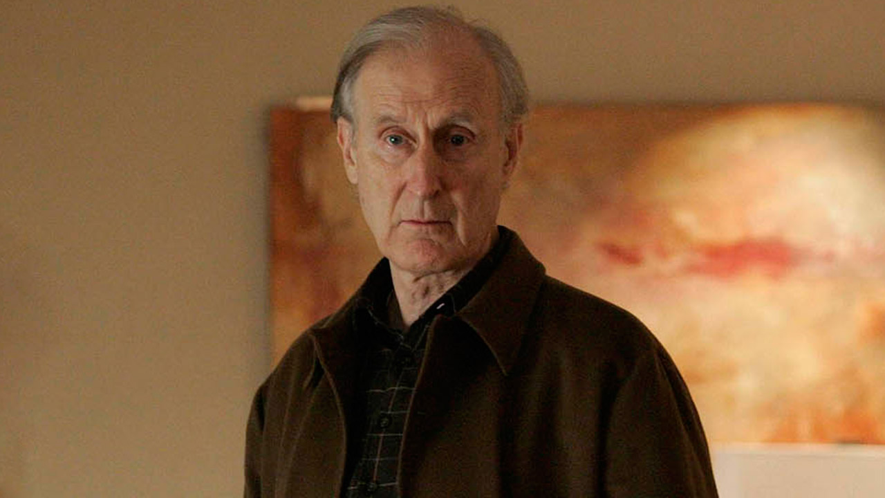 Description: A man standing in front of a painting in a room with a brown coat on and a black shirt on.