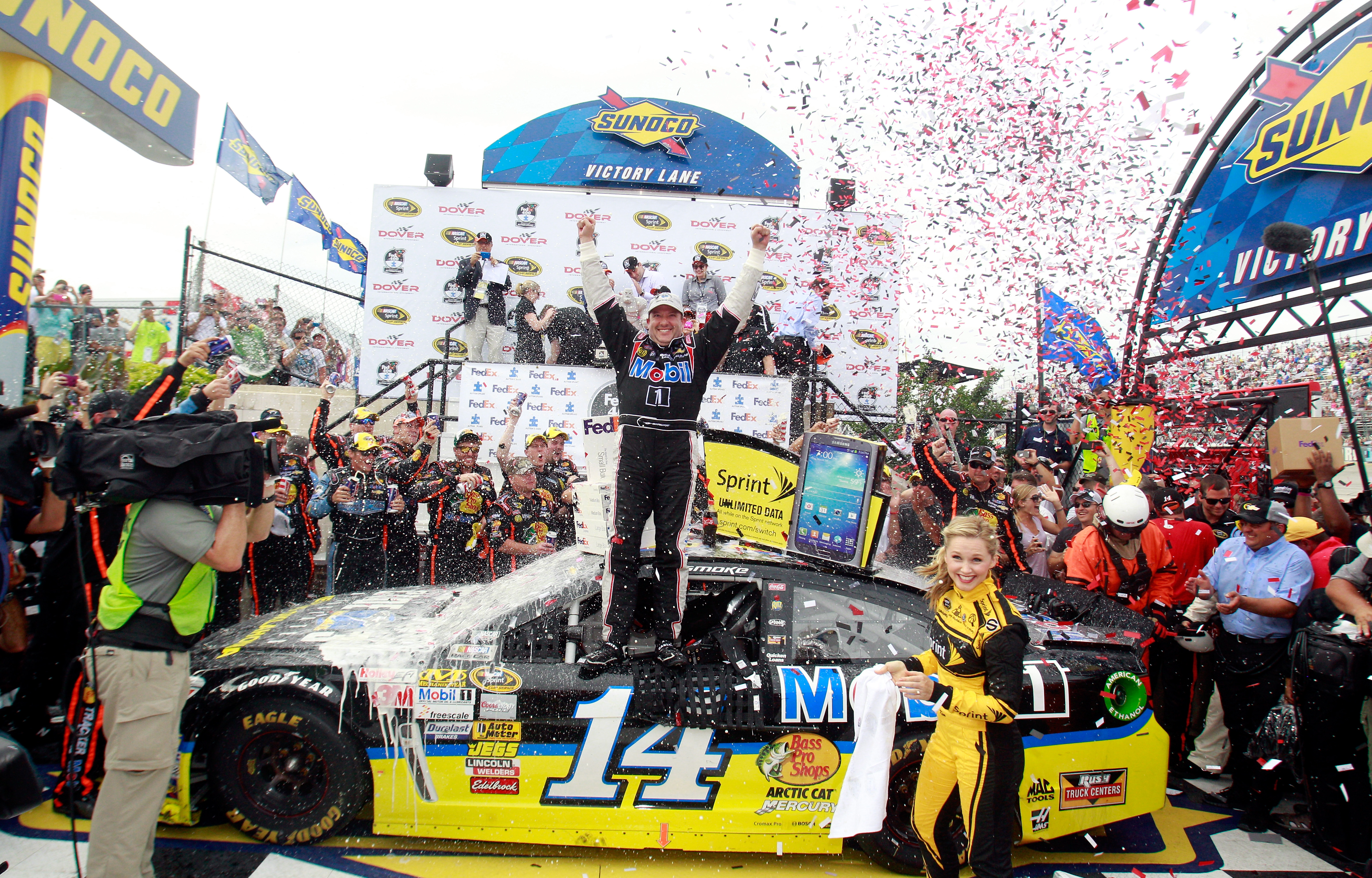 Description: A man standing on top of a race car with confetti in the air and confetti in the air.