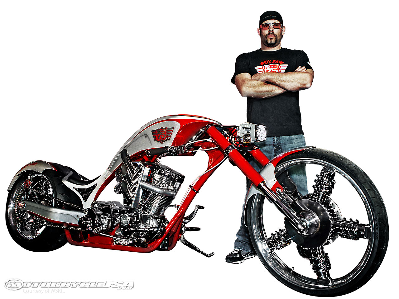 Description: A man standing next to a red and white motorcycle with a man standing next to it on a white background.