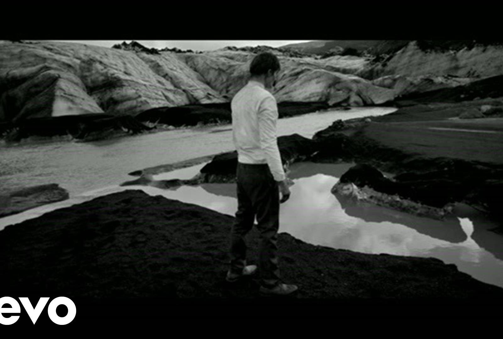 Description: A man standing on top of a rocky hillside next to a river and mountains in the background with a black and white photo.