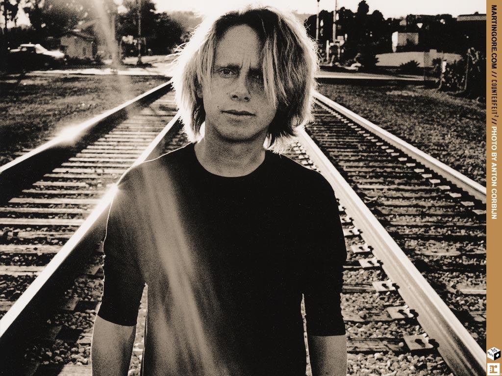 Description: A man standing on a train track with his arms crossed and his head tilted to the side of the track.