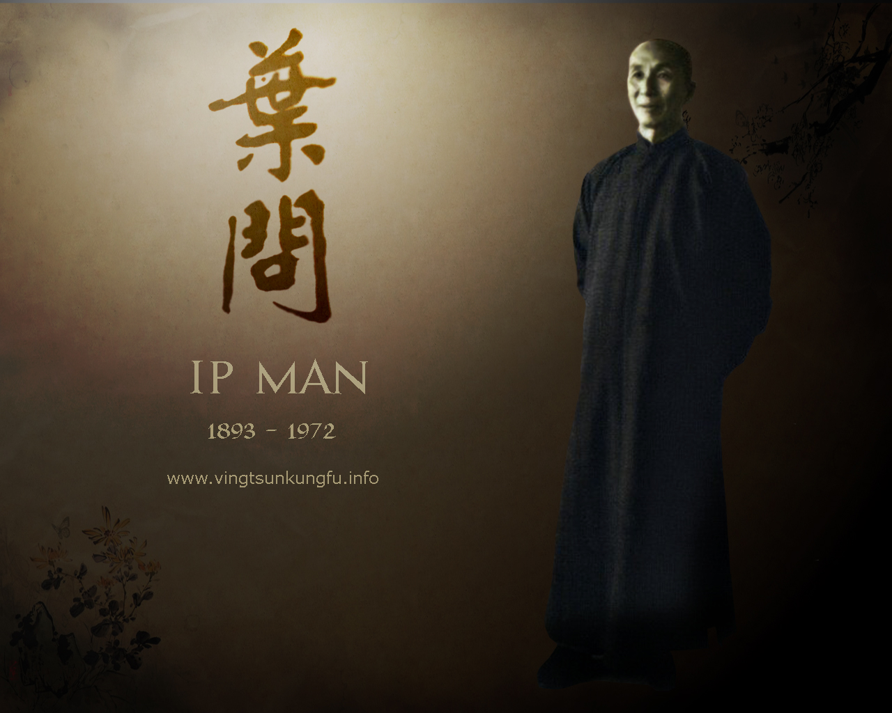 Description: A man standing in front of a wall with a chinese writing on it and a picture of a man in a black robe.