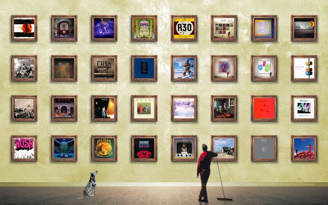 Description: A man standing in front of a wall with many framed pictures on it and a small dog standing in front of it.