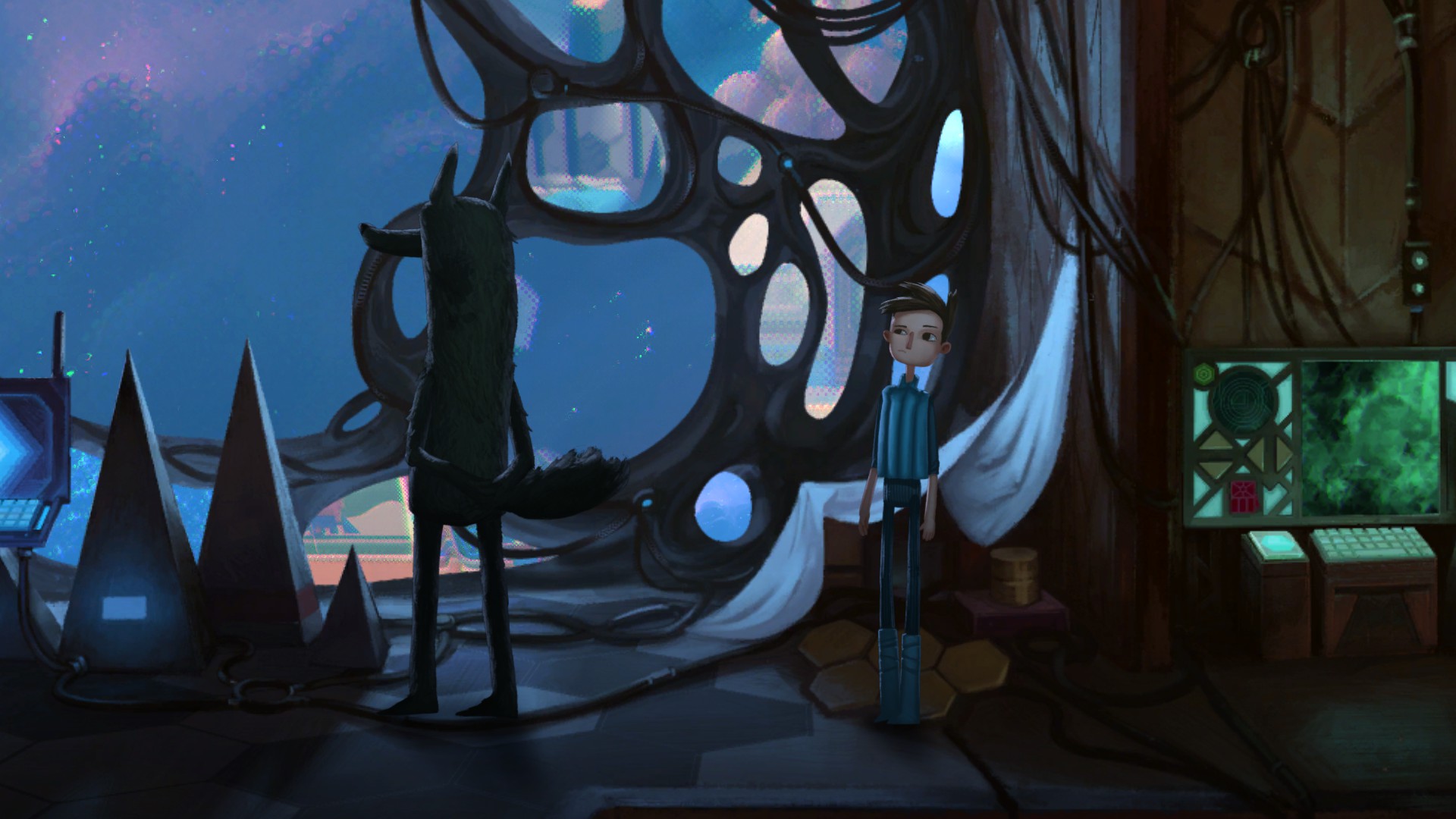 Description: A man standing in front of a window in a room with a giant window and a sky background with stars.