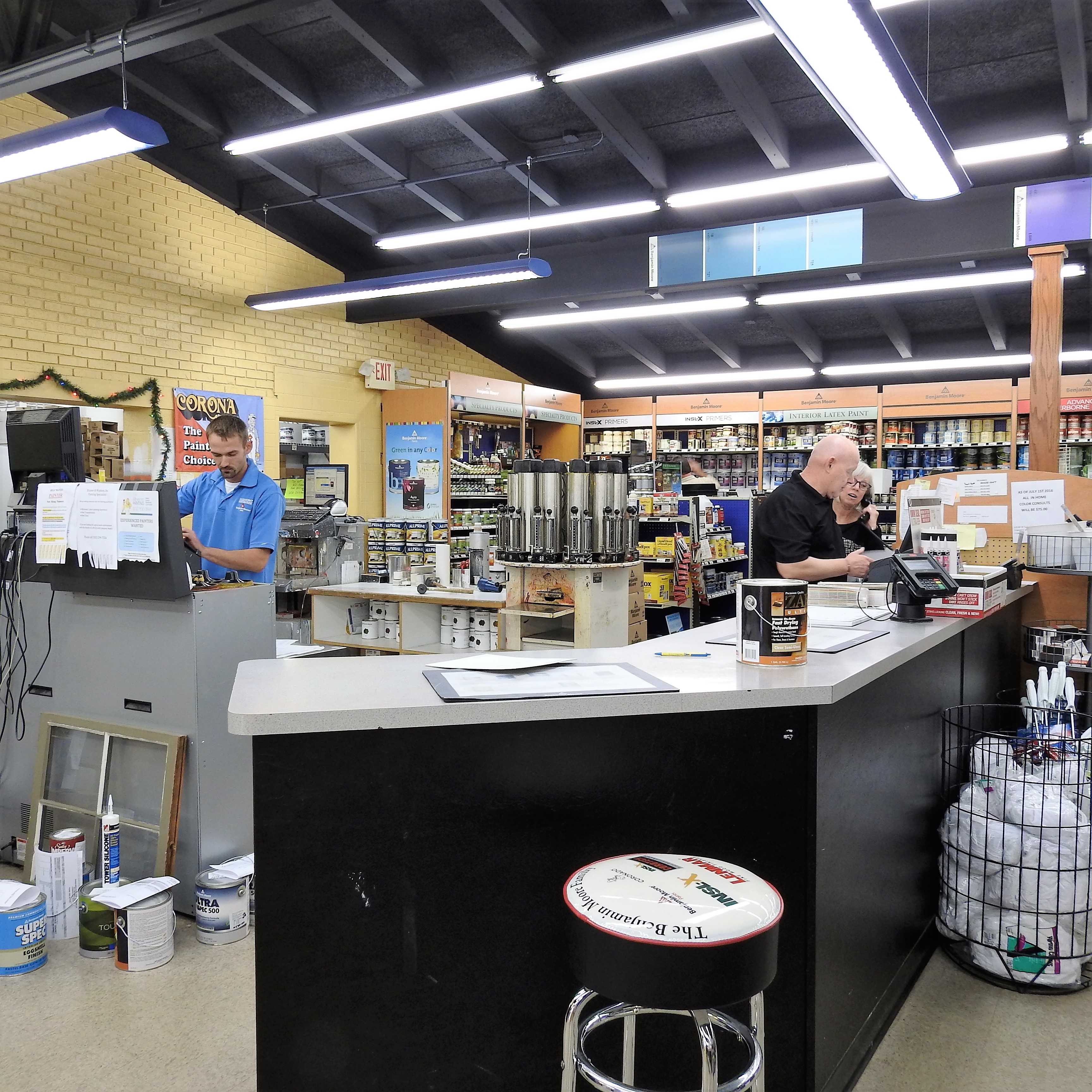 Description: A man is standing at a counter in a store with a surfboard on it and a man is standing behind him.