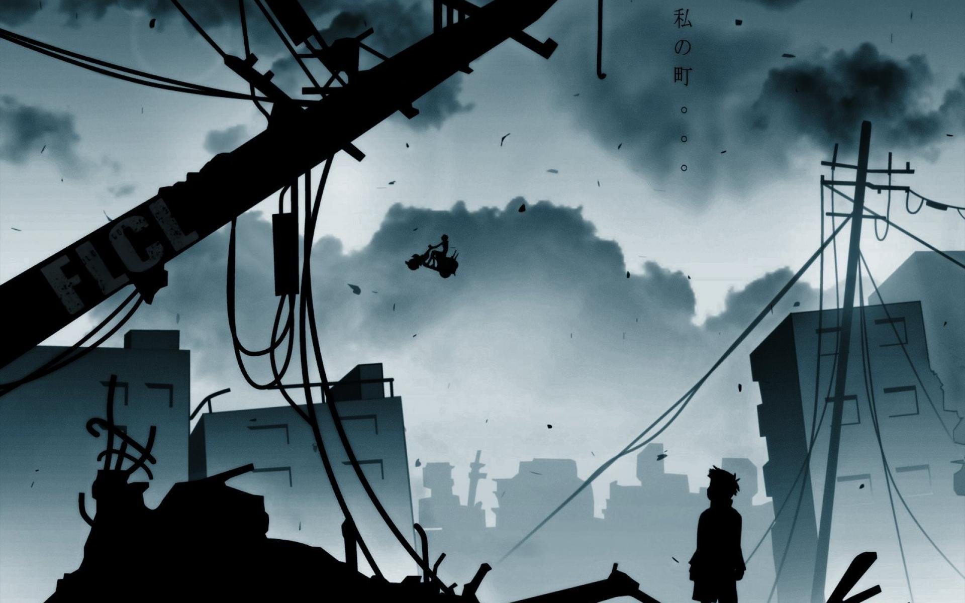 Description: A man standing on a street next to a tall building with a sky background and a person flying a kite.