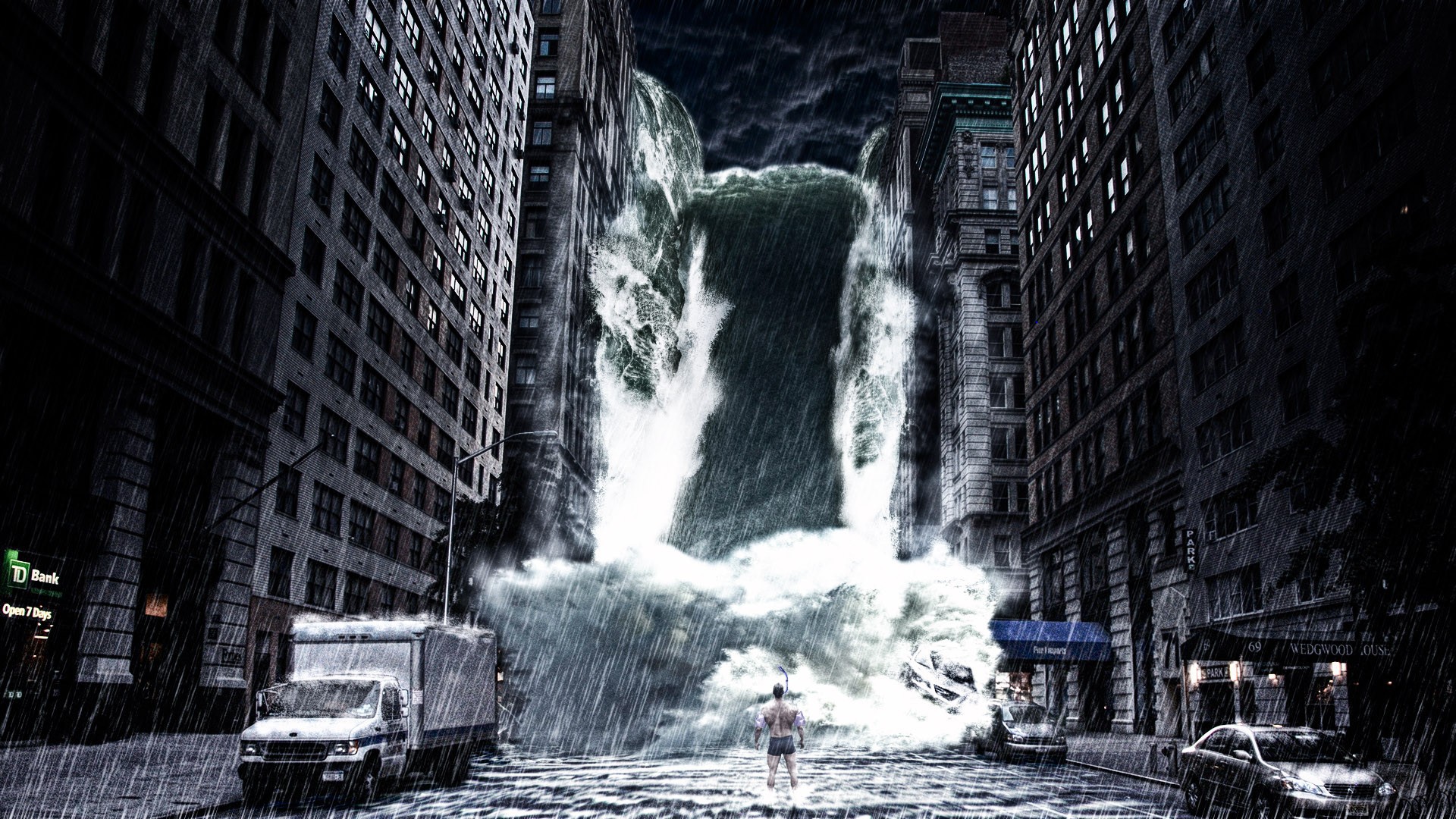 Description: A man standing in the middle of a street next to a waterfall in the middle of a city at night.
