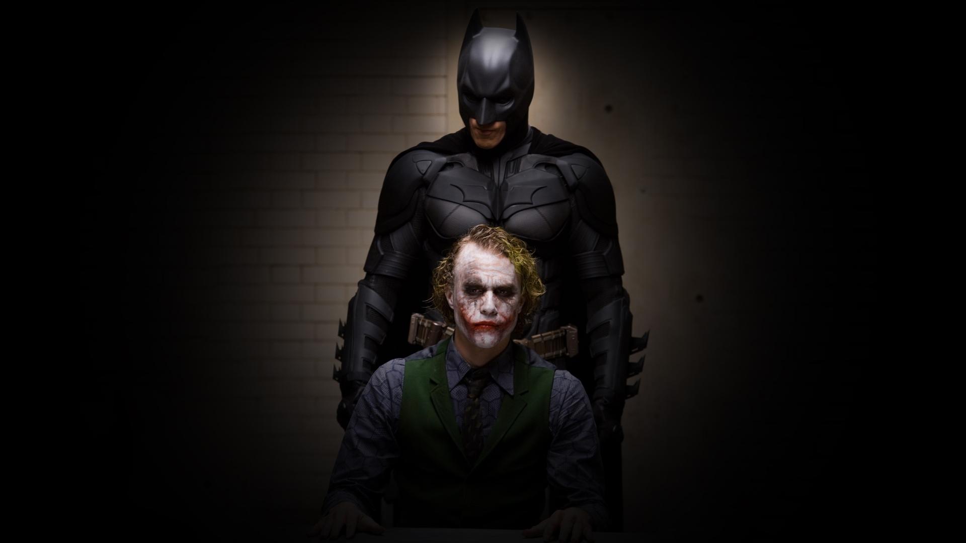 Description: A man in a suit and a man in a batman costume standing next to each other in a dark room.
