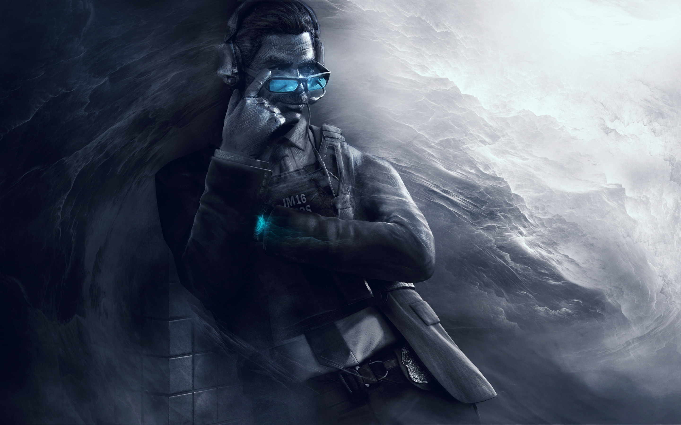 Description: A man in a suit and blue goggles holding a gun in his hand and a dark background with a wave.