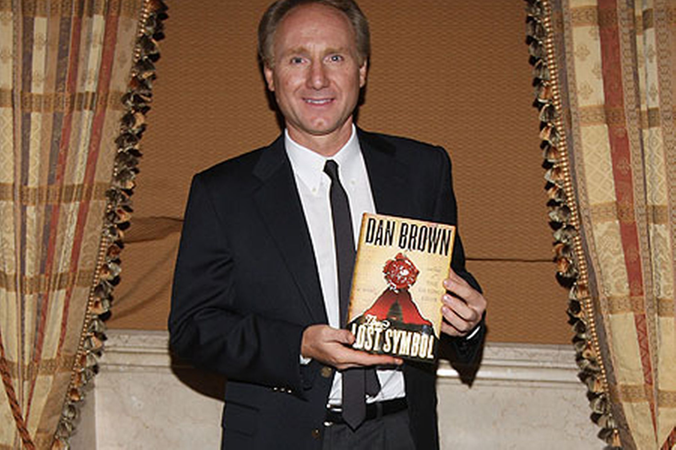 Description: A man in a suit holding a book in his hands and smiling at the camera while standing in front of a curtain.