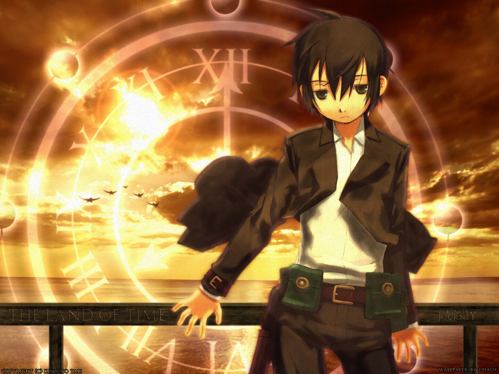 Description: A man in a suit standing in front of a clock with a sunset in the background and a bird flying overhead.