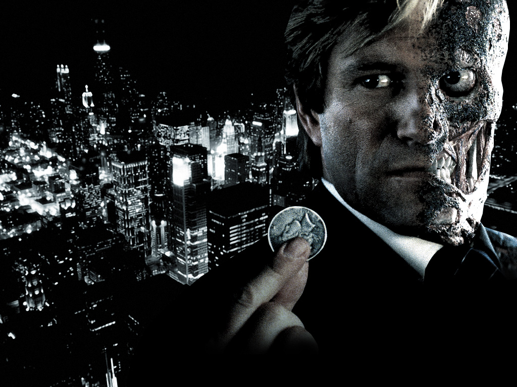 Description: A man in a suit holding a coin in his hand and a city in the background at night time.
