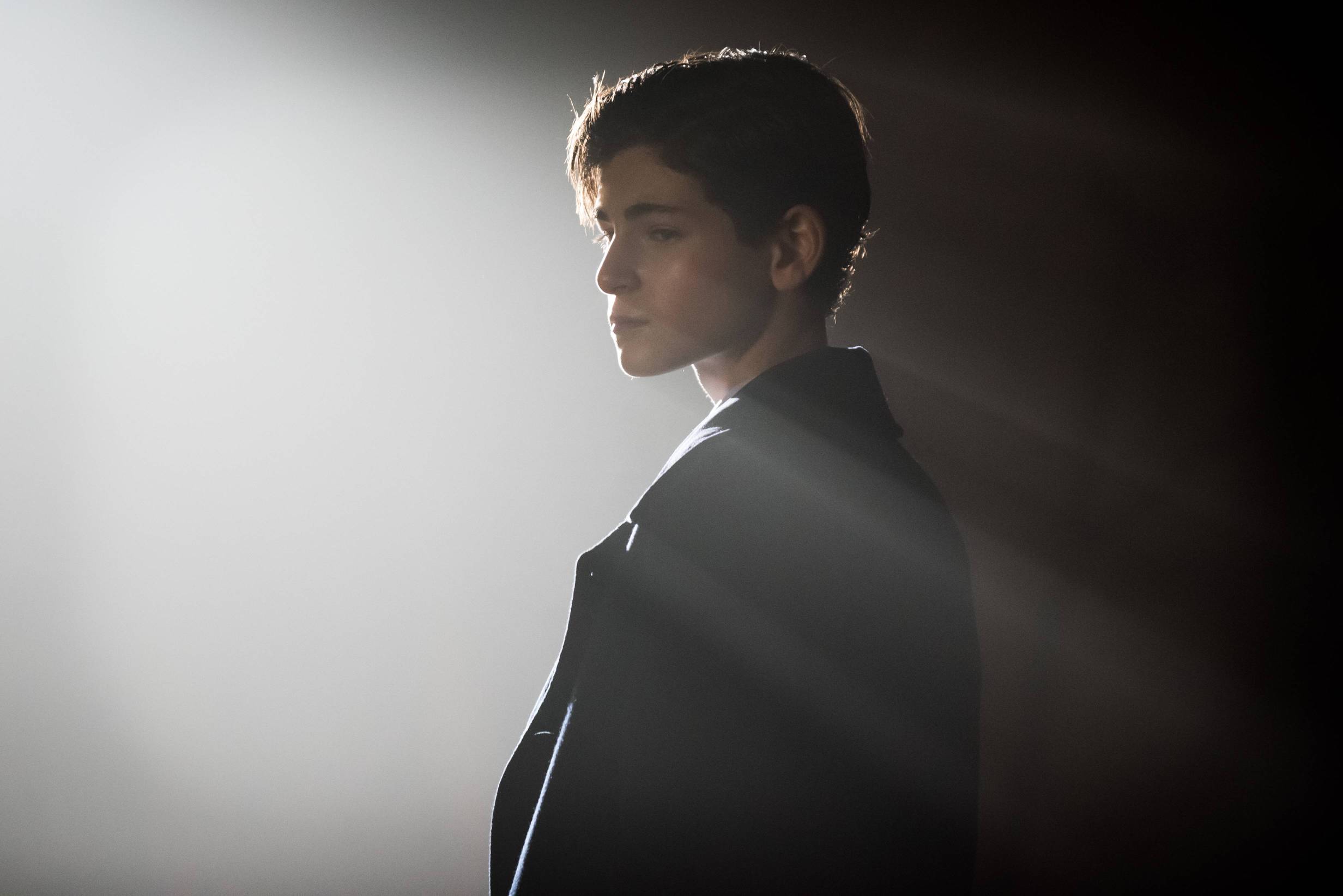 Description: A man in a suit standing in the dark with a light shining on him and his head tilted back.