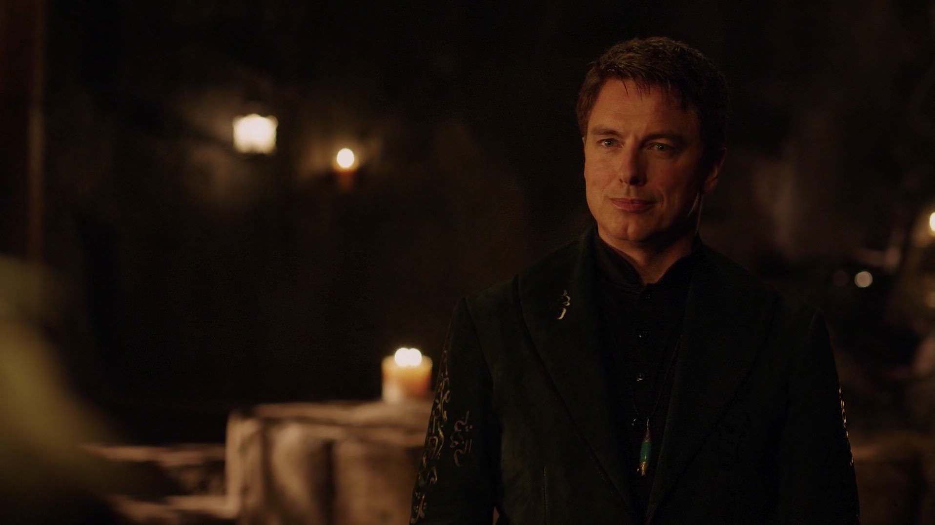 Description: A man in a suit standing in a dark room with candles in the background and a table with a cloth draped around it.
