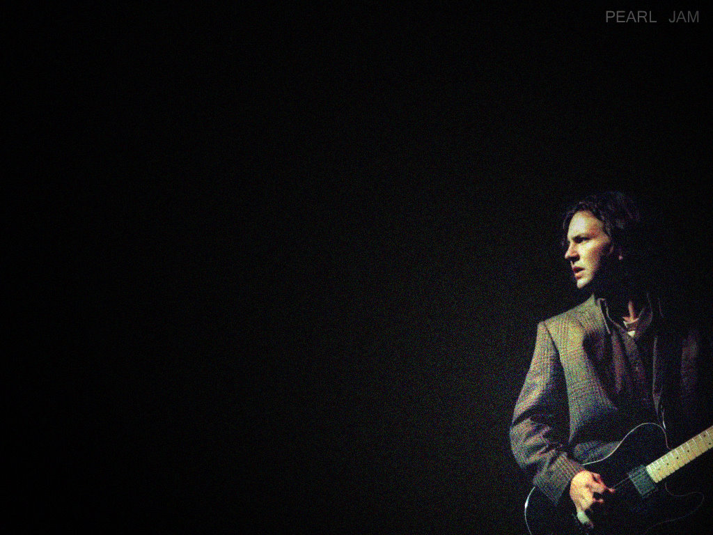 Description: A man in a suit holding a guitar in the dark with a microphone in his hand and a microphone in his other hand.