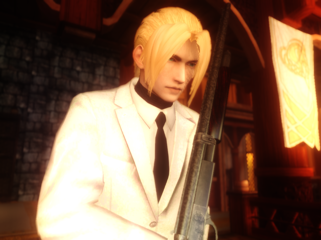 Description: A man in a suit holding a gun in a room with a flag on the wall and a clock on the wall.