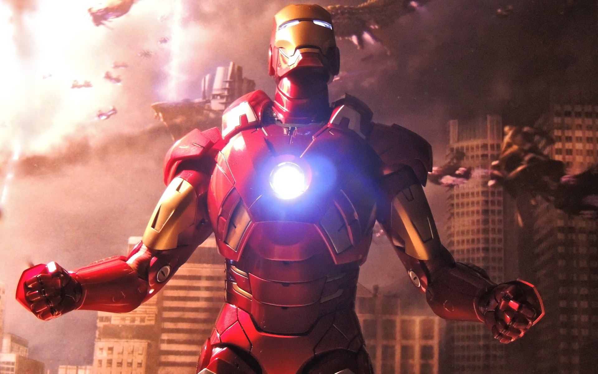 Description: A man in a suit with a light on his hand in front of a city skyline with a helicopter.