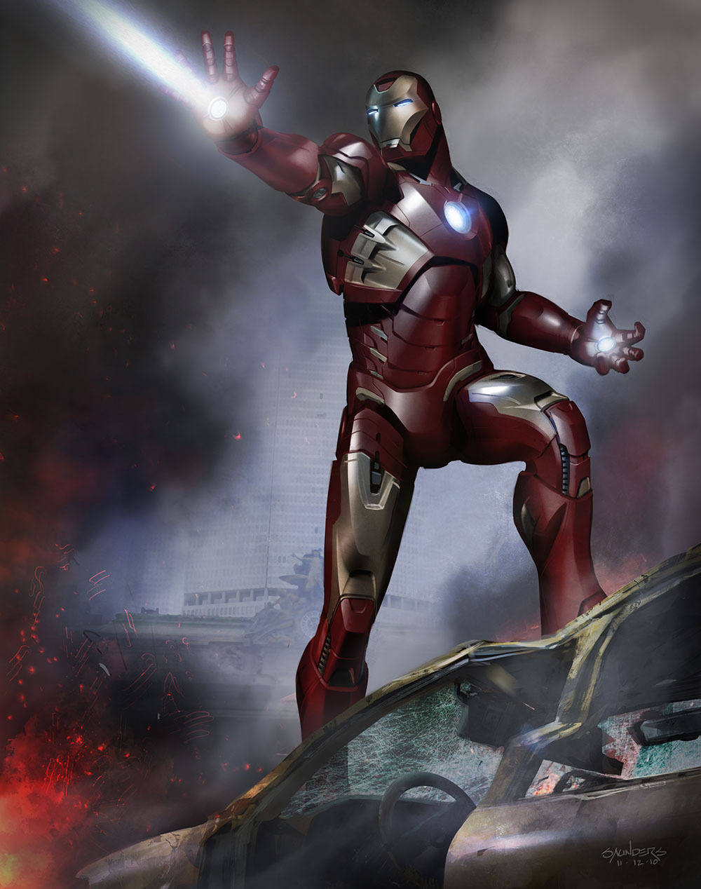 Description: A man in a suit is holding a light saber in his hand and standing on a rock in front of a fire.
