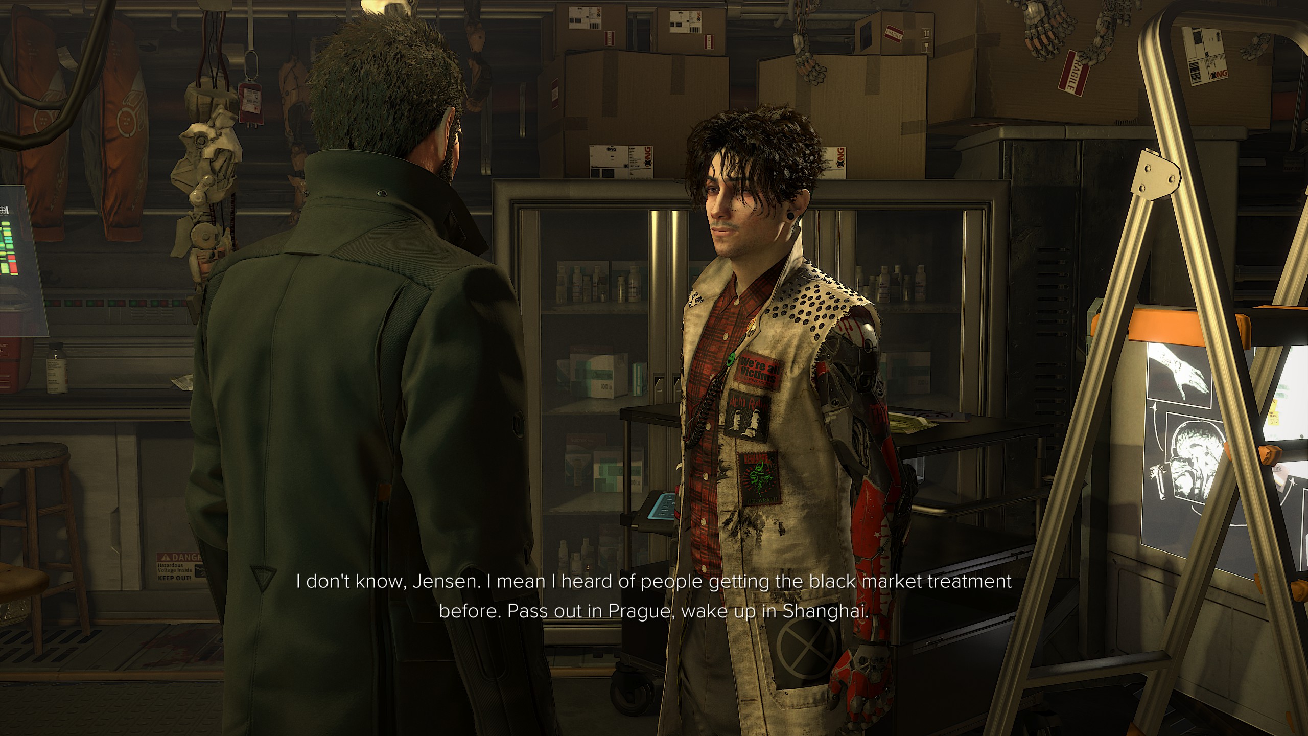 Description: A man in a suit and a man in a green coat in a room with shelves and a television.