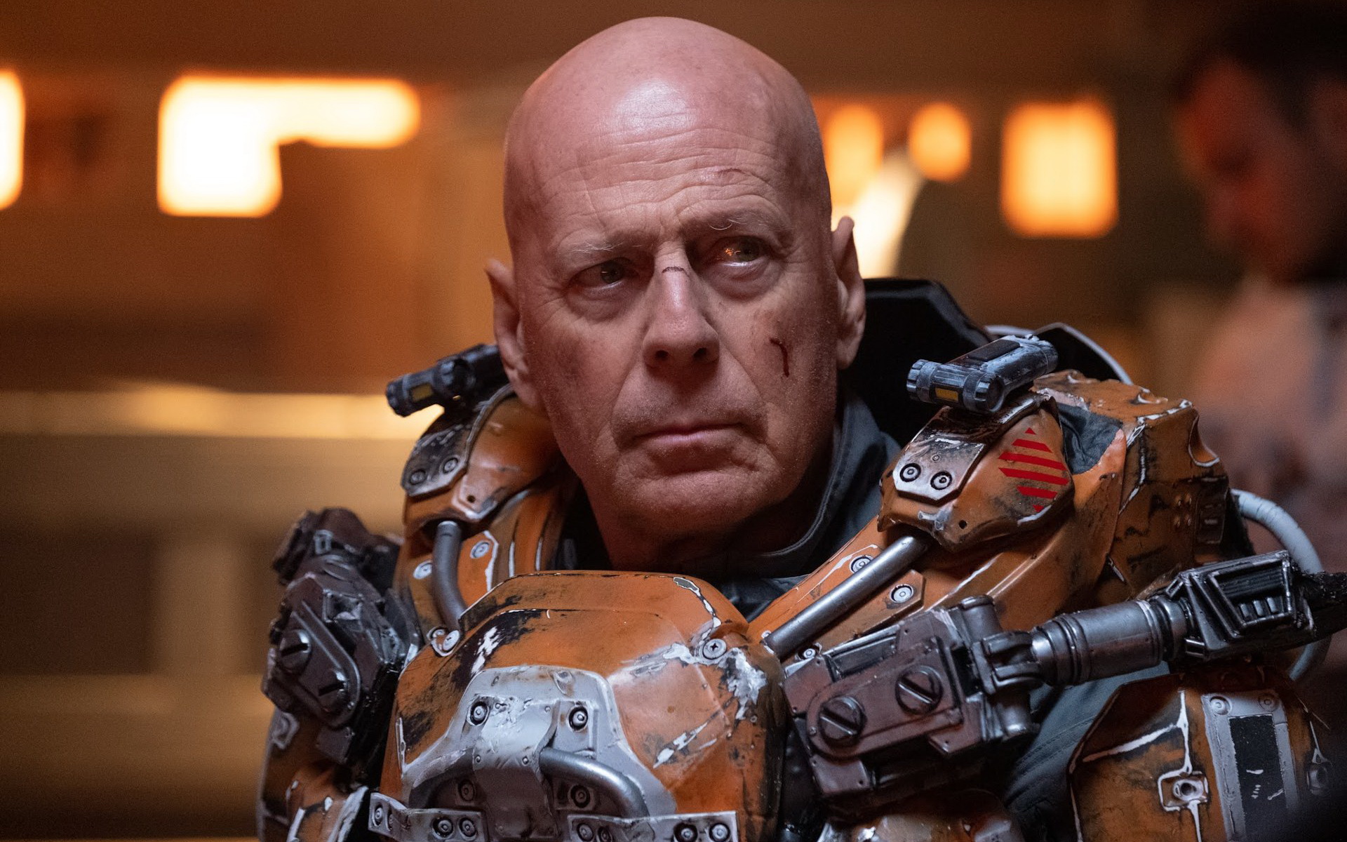 Description: A man in a suit with a large metal arm and a large metal helmet on his head and a large metal arm.