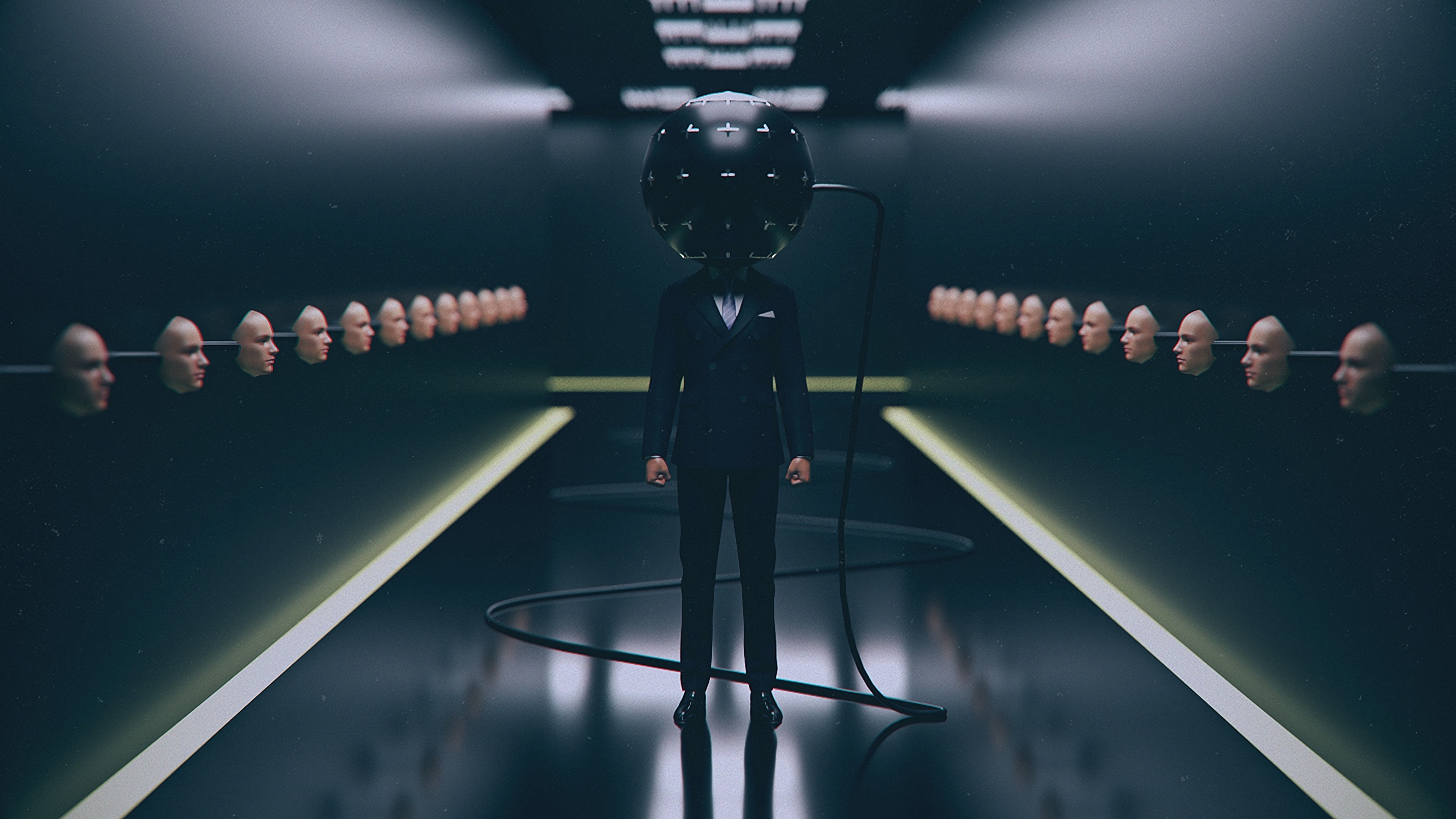 Description: A man in a suit and a microphone in a room with many heads on the floor and a light at the end of the room.