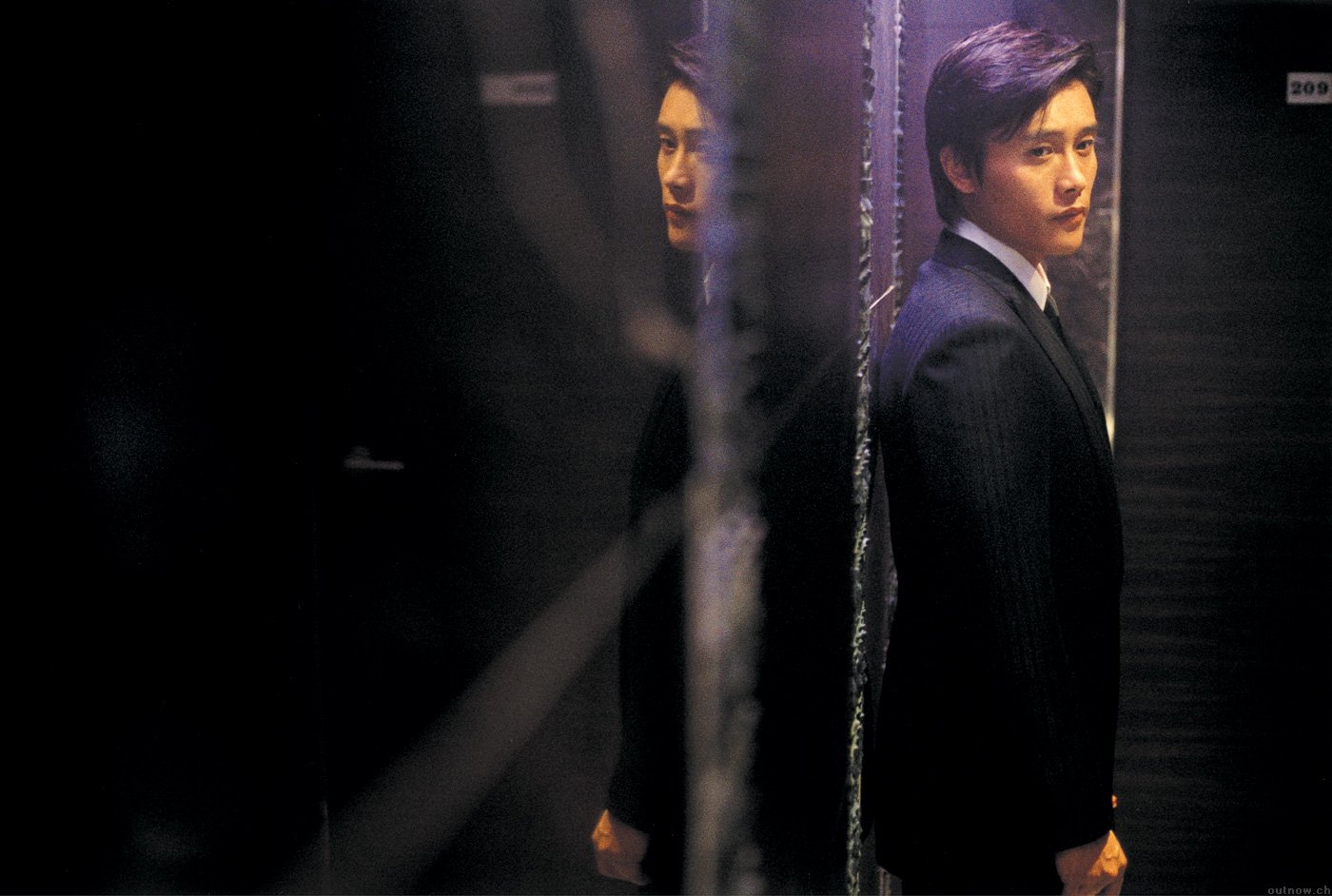 Description: A man in a suit standing in front of a mirror in a room with a door open and another man in the background.