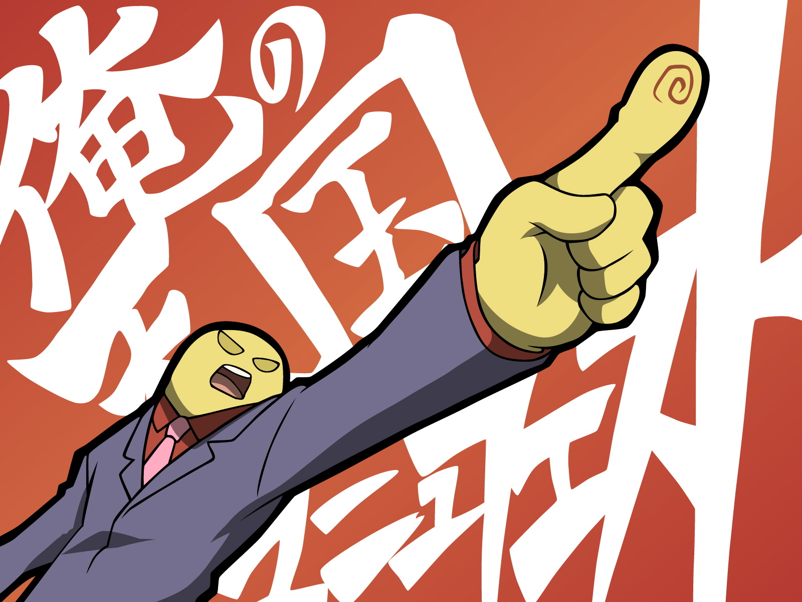 Description: A man in a suit pointing at something with his finger up in a cartoon style with asian writing on the background.