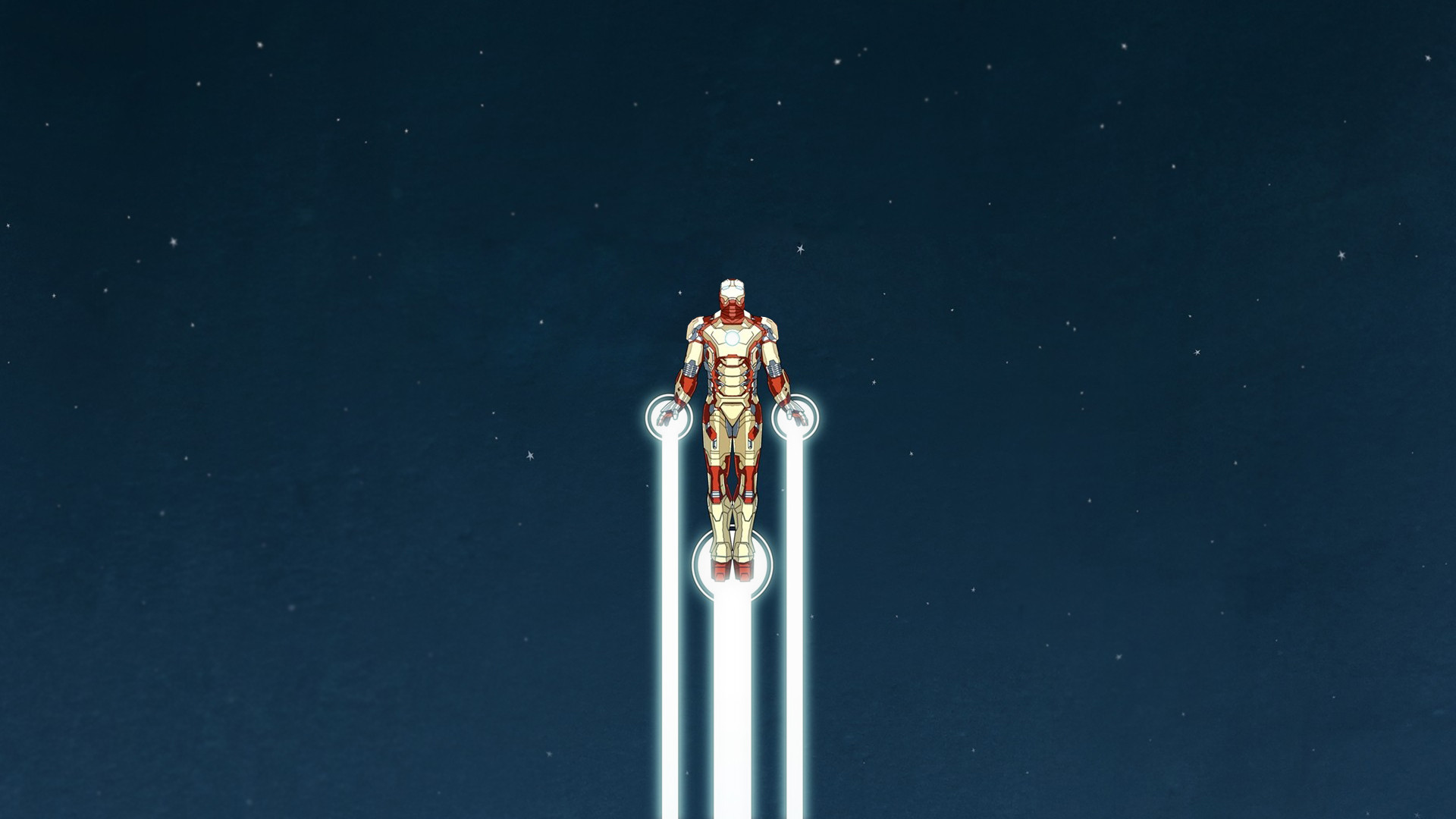 Description: A man in a suit is on a pair of skis in the air with a star background and a sky full of stars.