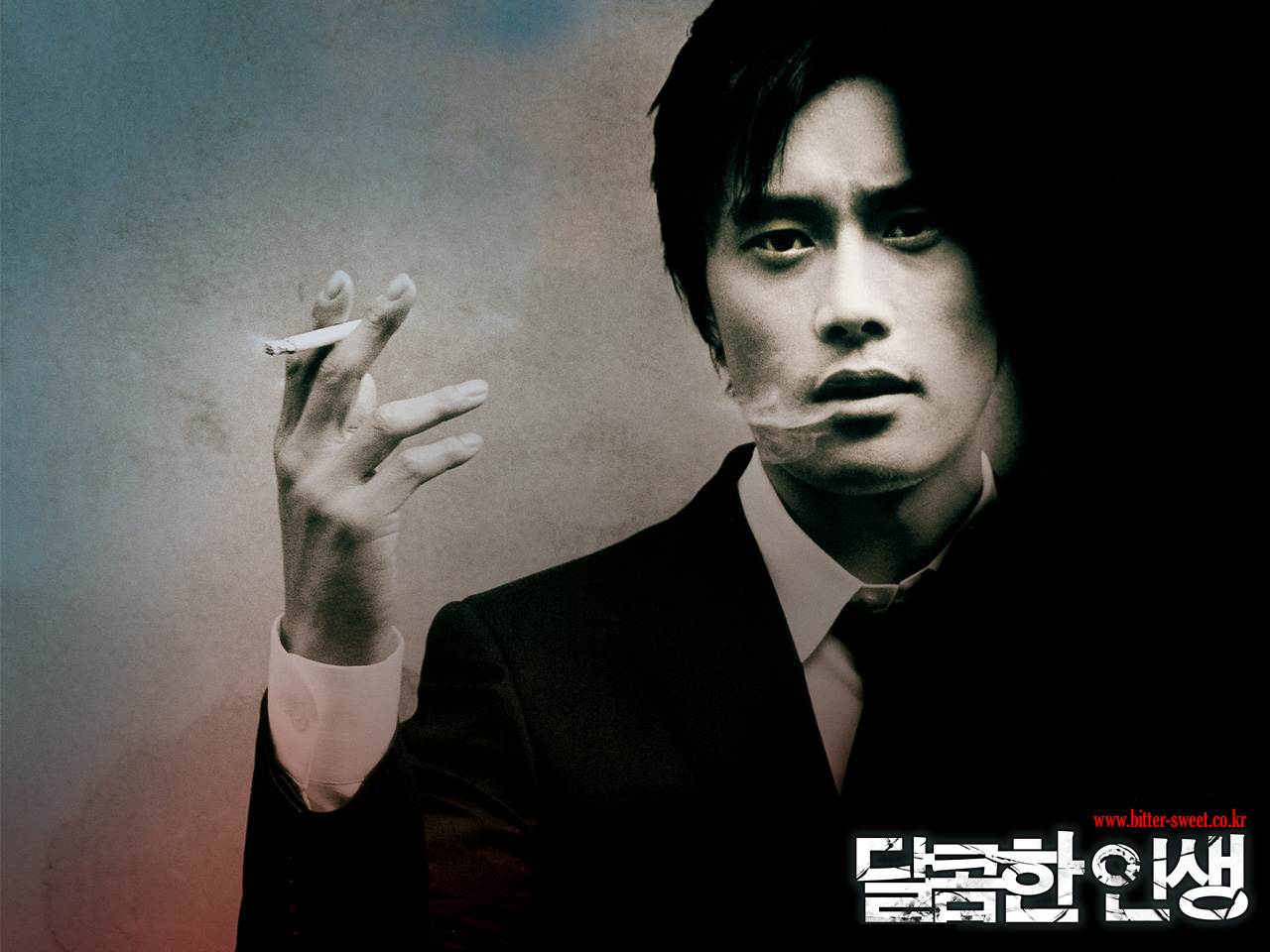 Description: A man in a suit smoking a cigarette in a dark room with a red and blue background and a blue sky.