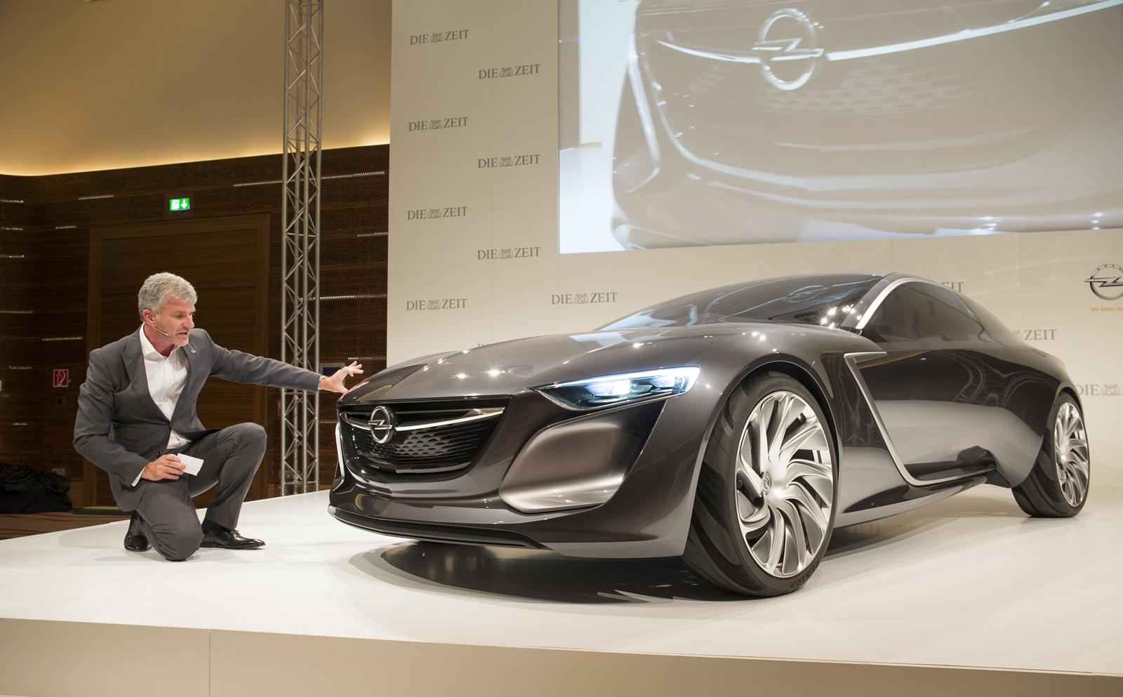 Description: A man in a suit sitting on a stage next to a car on display at a car show with a projection screen behind him.