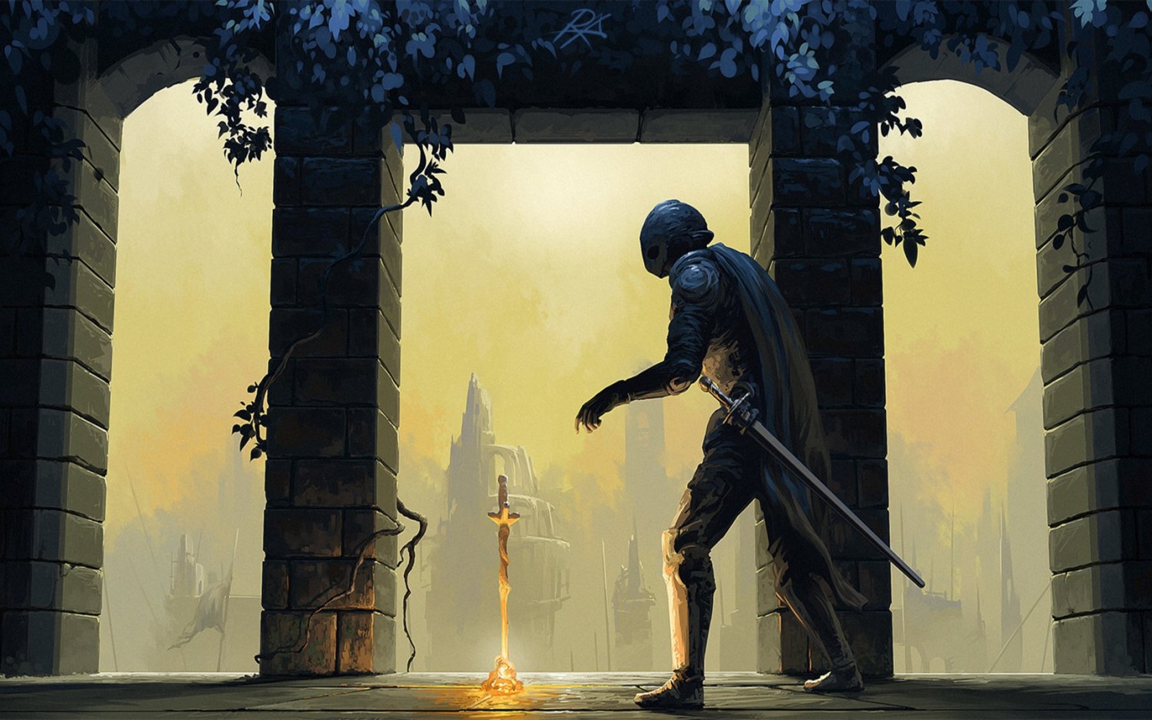 Description: A man in a black suit holding a sword in a doorway with a yellow sky in the background and a building with a clock tower.