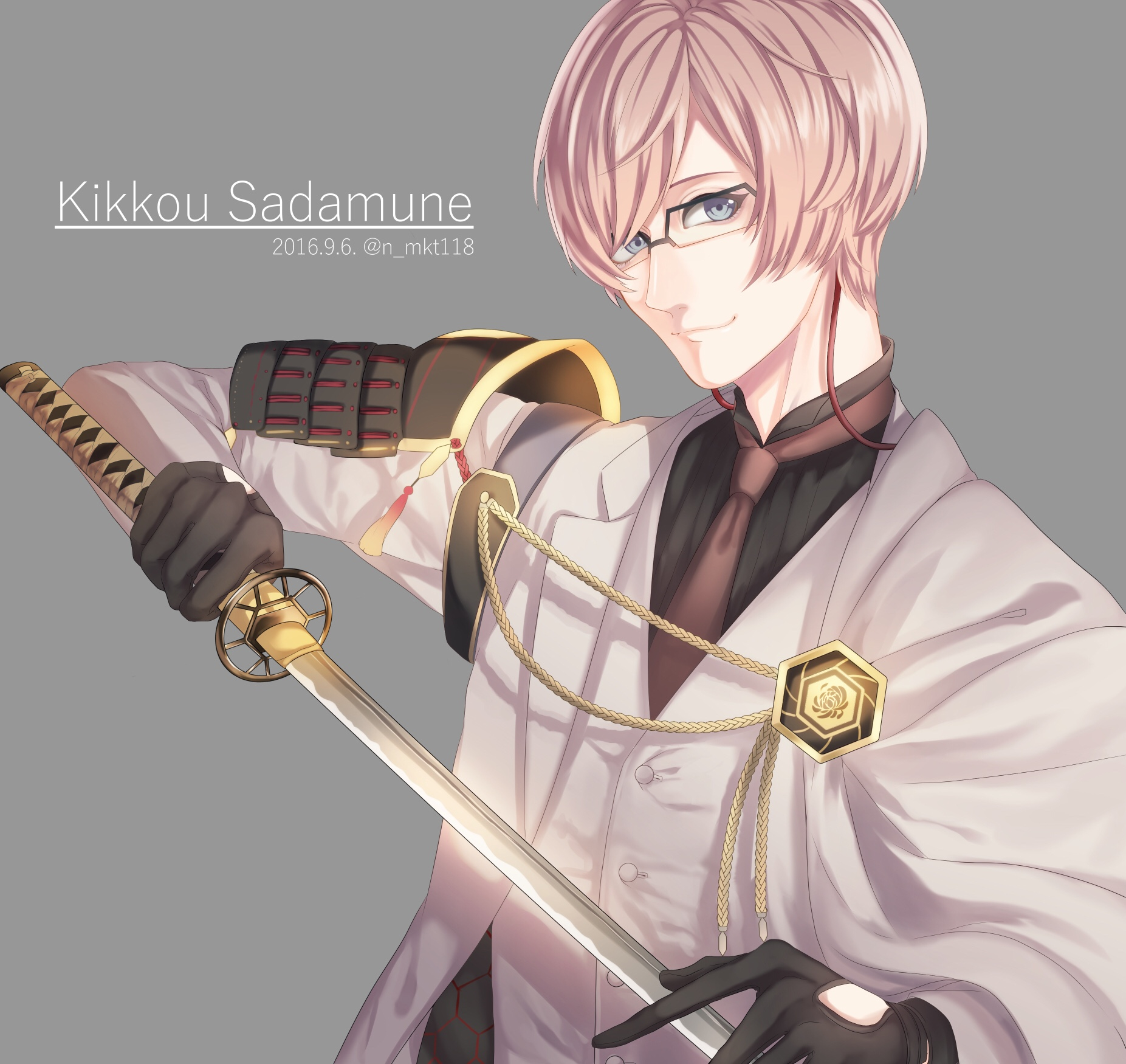 Description: A man with a sword and a suit on holding a sword in his hand and a name tag on the side of the image.