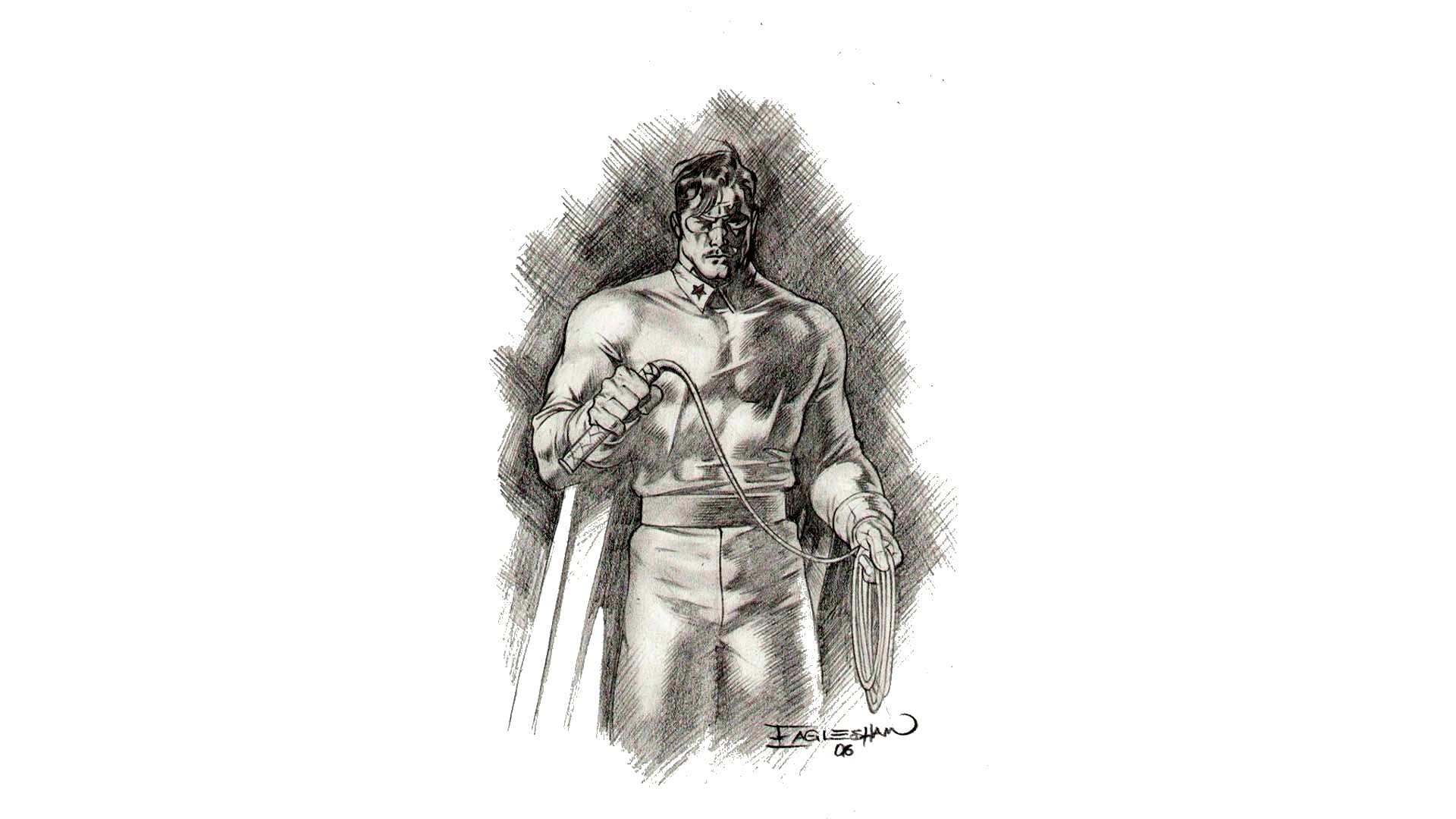Description: A drawing of a man in a suit holding a sword and a shield with a sword in his hand.