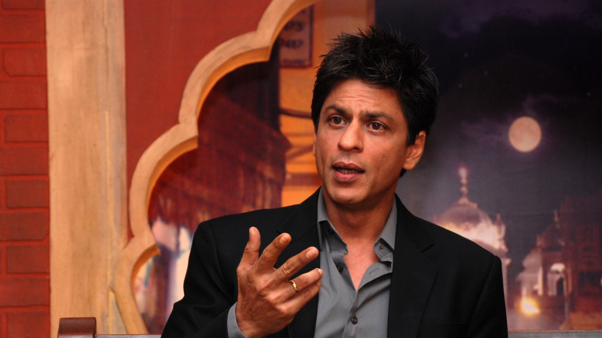Description: A man in a suit is talking to someone on a television set with a clock in the background and a red brick wall.