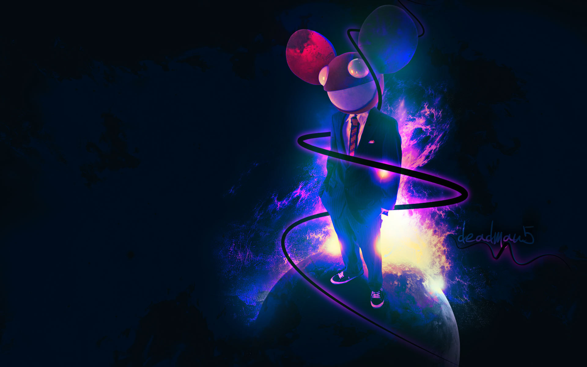 Description: A man in a suit and tie with a balloon in his hand on a space background with a spiral line.