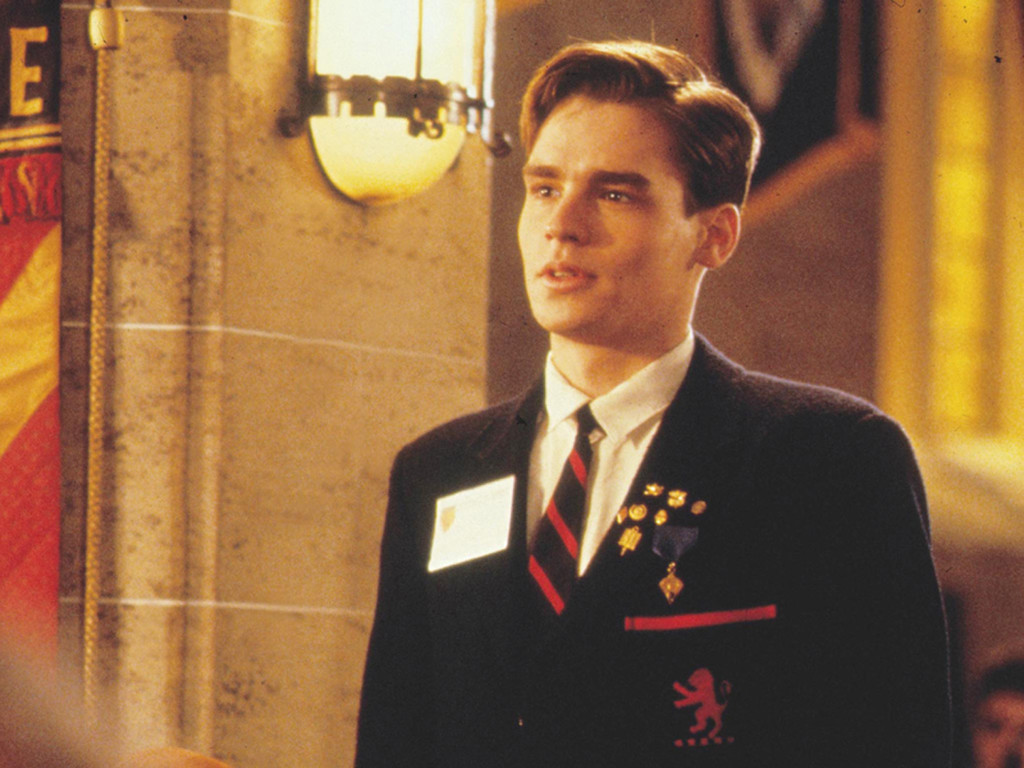 Description: A man in a suit and tie standing in front of a building with a flag on it's side.