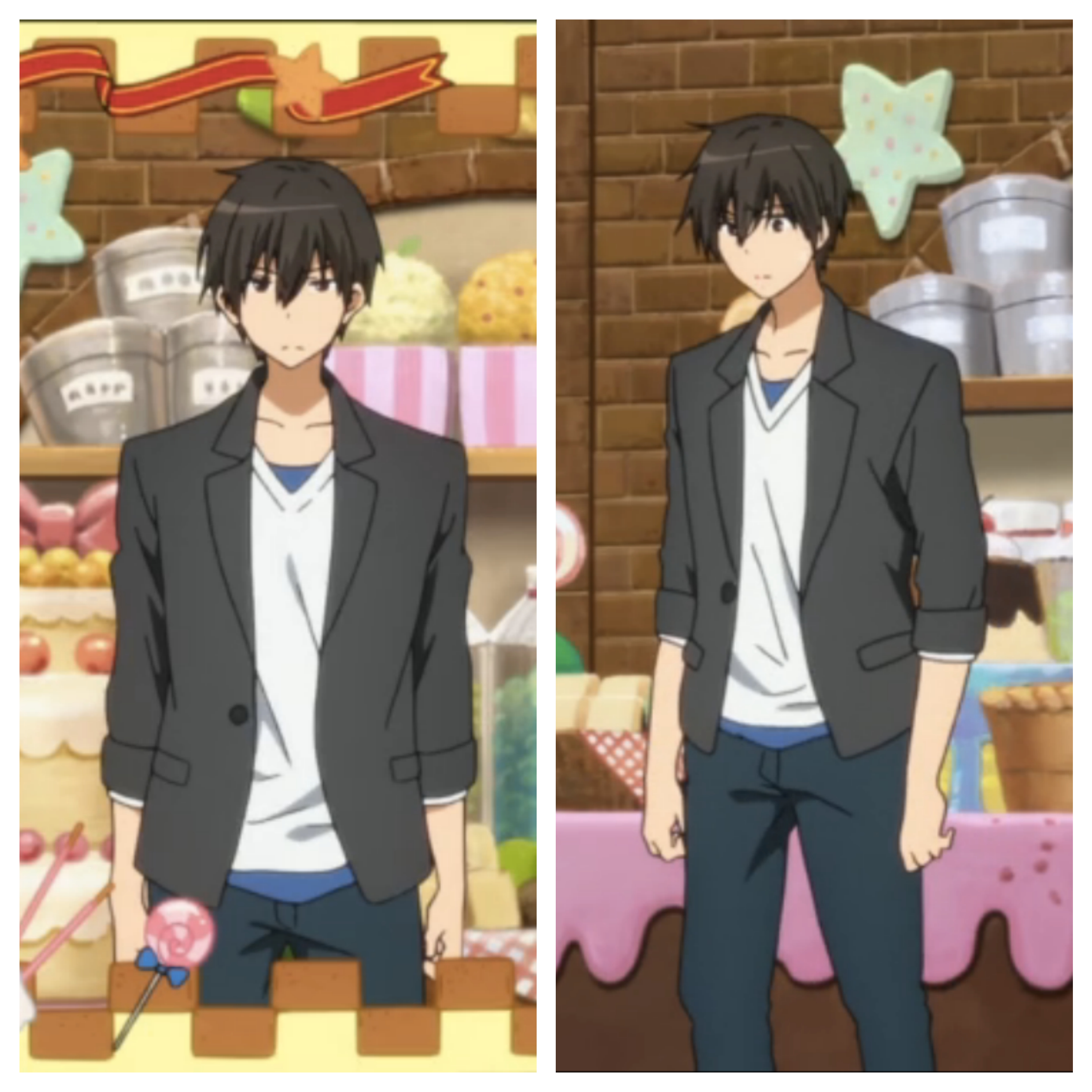Description: Two pictures of a man in a suit and tie standing in front of a counter with food on it.