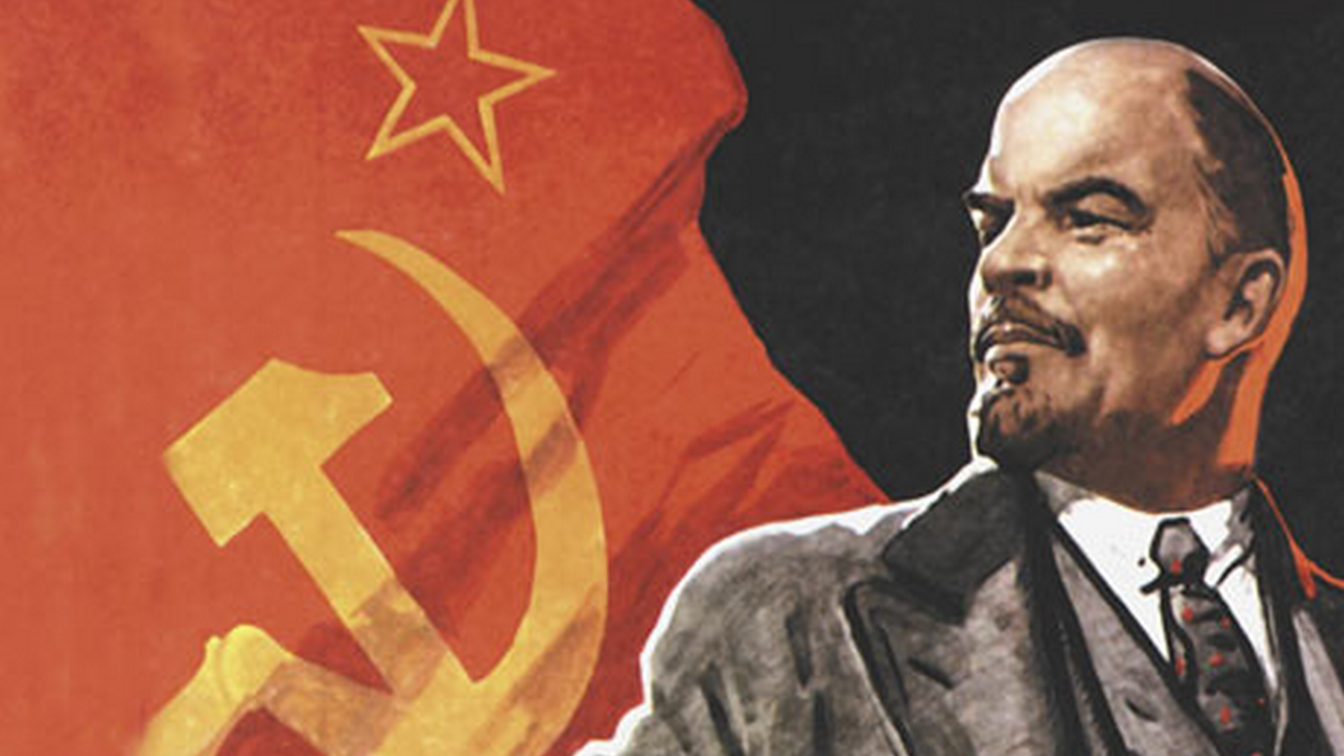 Description: A man in a suit and tie standing in front of a flag with a hammer and sick star on it.