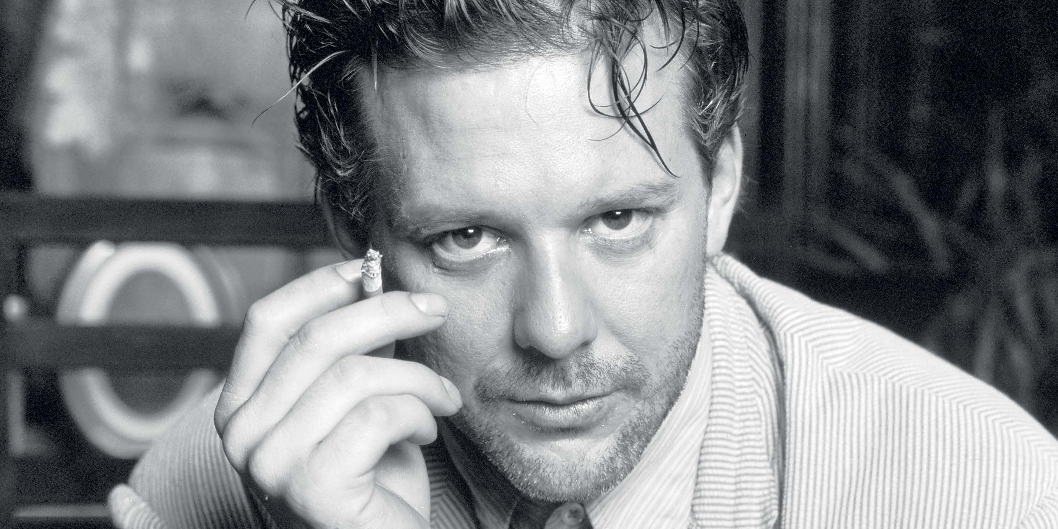 Description: A man in a suit and tie is holding a ring to his ear and looking at the camera with a serious look on his face.