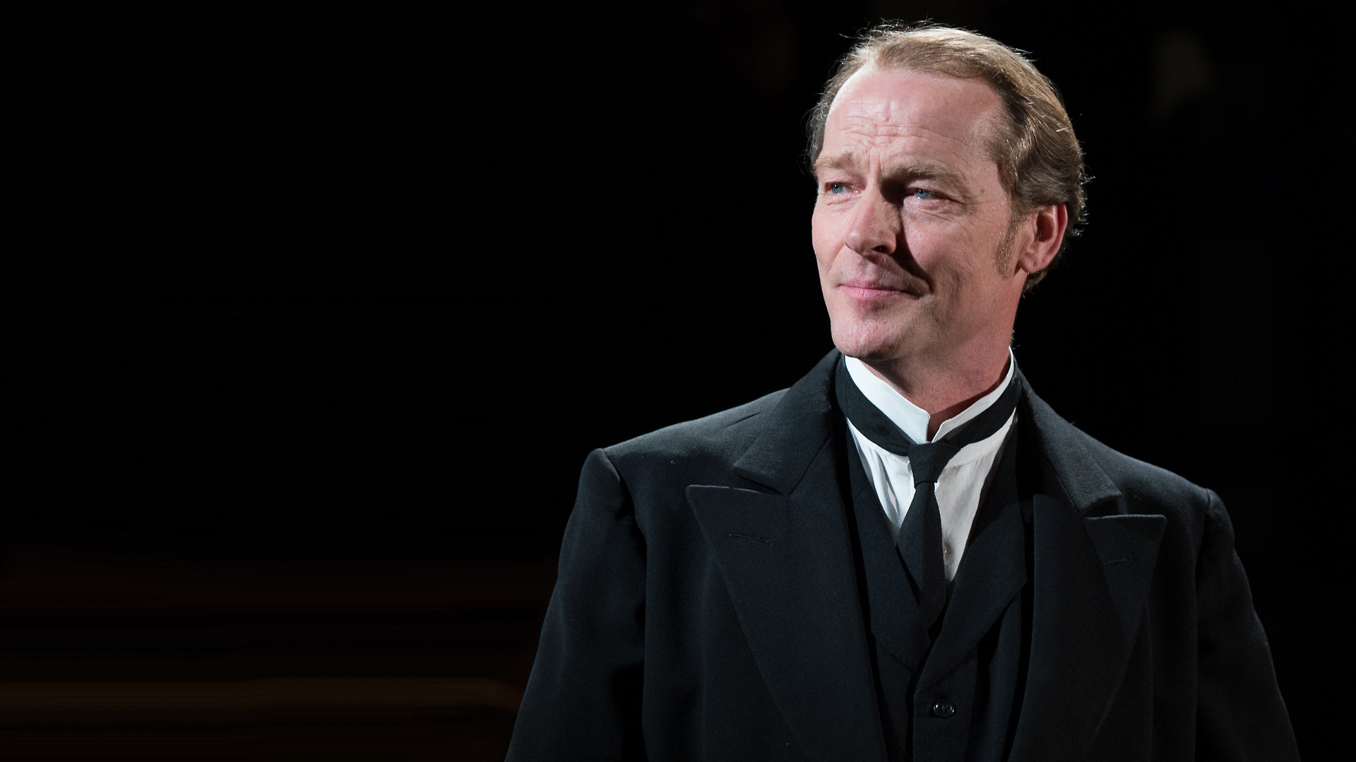 Description: A man in a suit and tie looking off to the side with a black background and a black background.