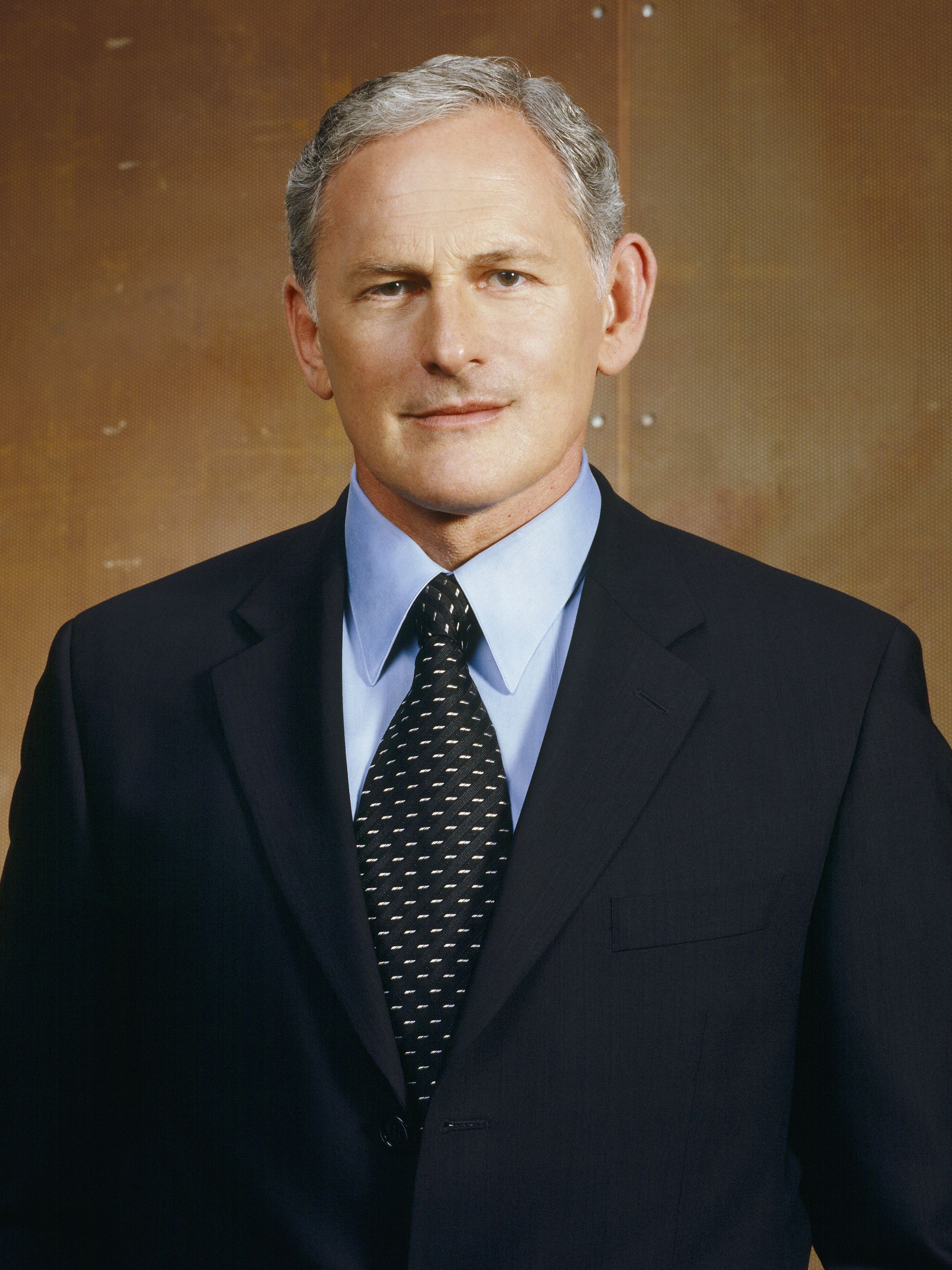 Description: A man in a suit and tie posing for a picture in front of a wall with a brown background.