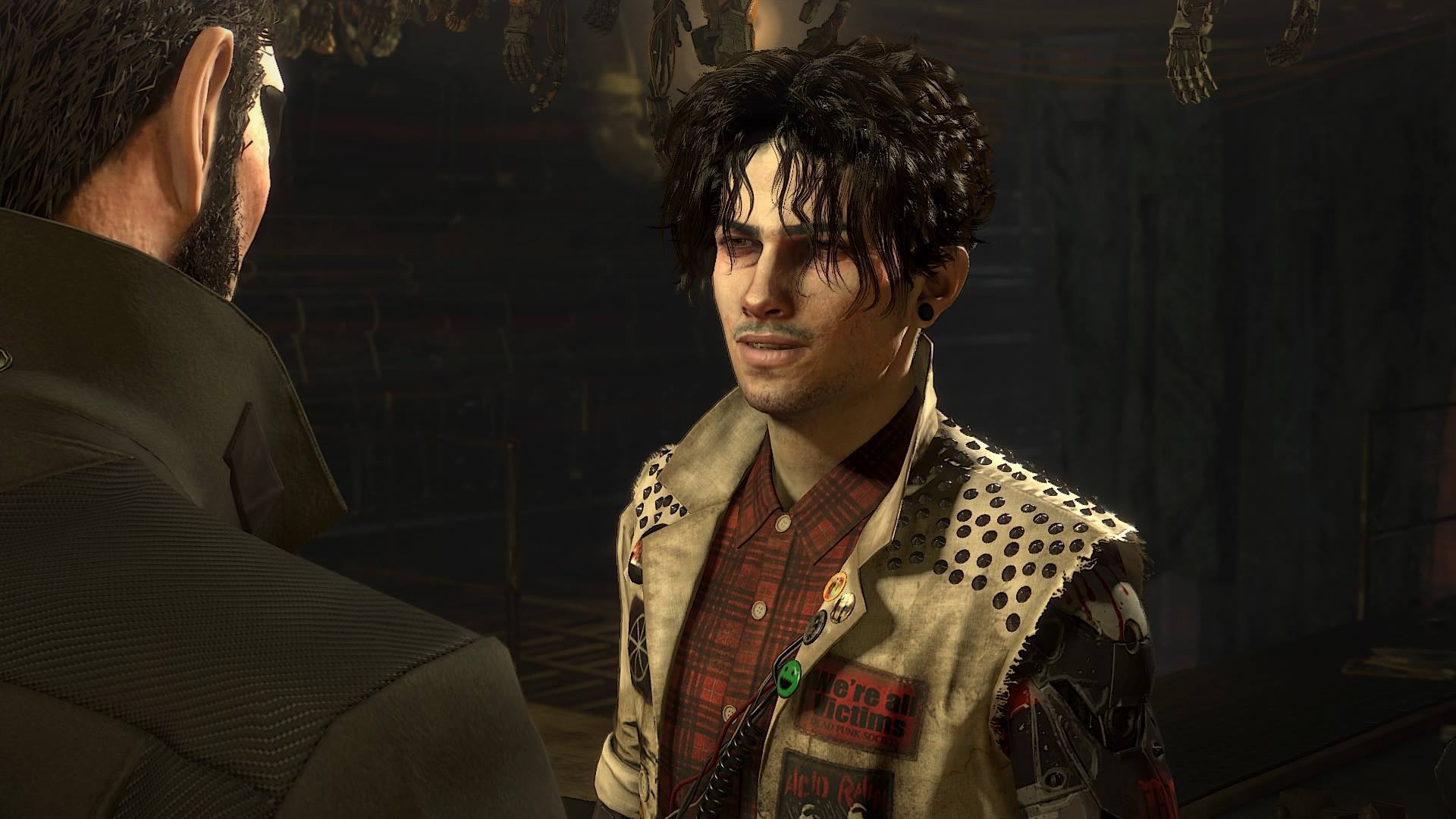 Description: A man in a suit and tie standing next to another man in a suit and tie in a dark room.