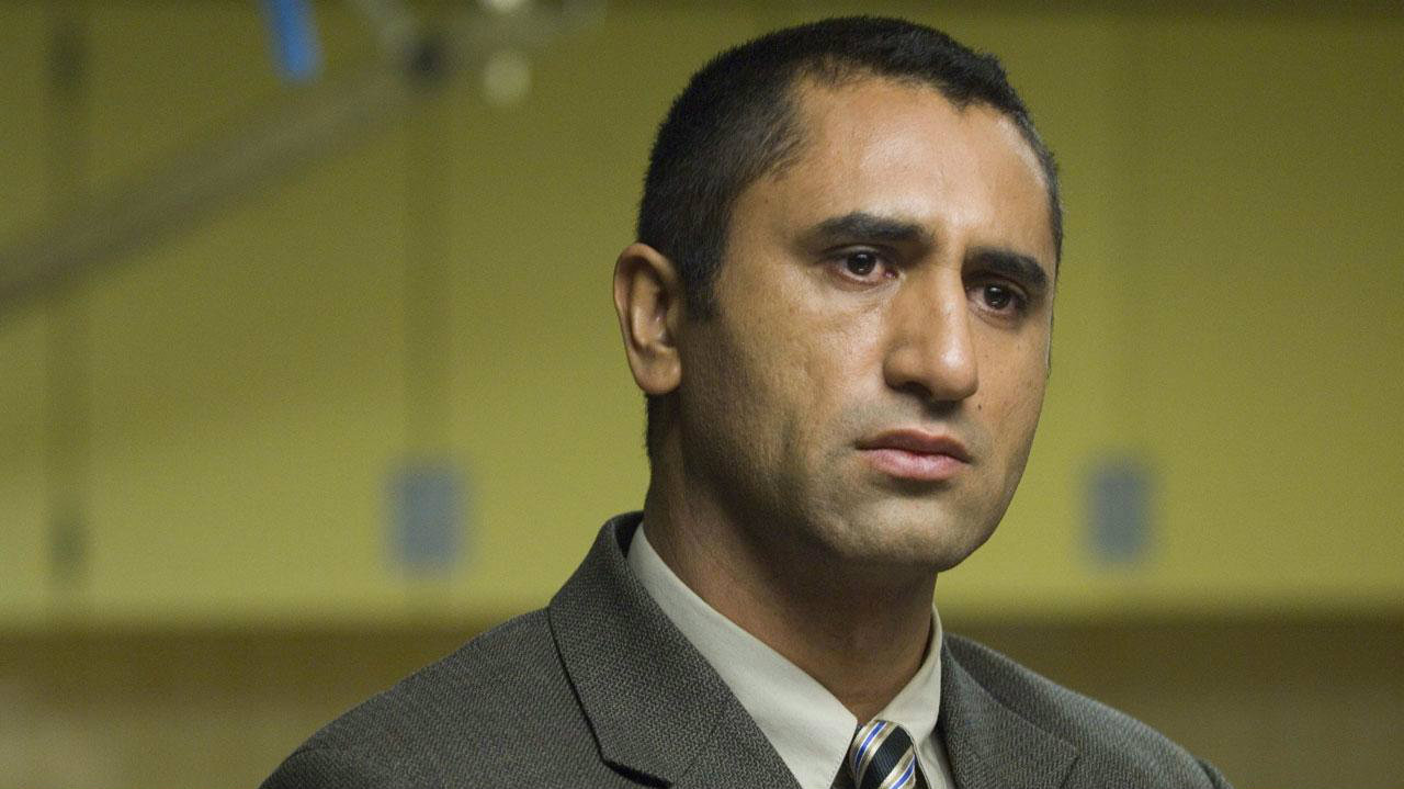 Description: A man in a suit and tie looking at the camera with a serious look on his face and shoulders.