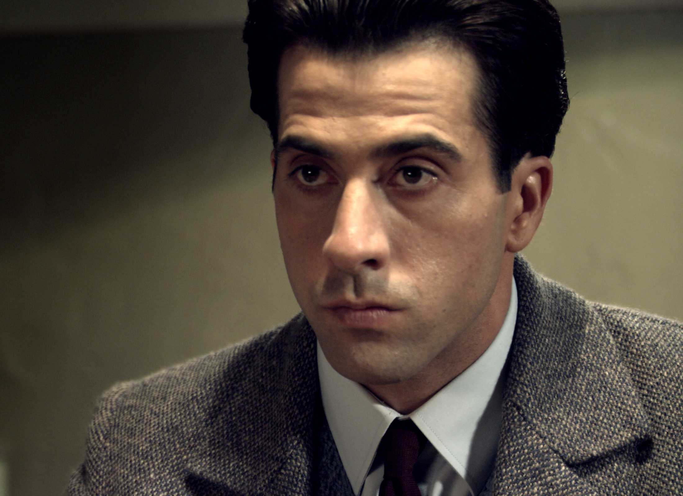 Description: A man in a suit and tie looking at the camera with a serious look on his face and shoulders.