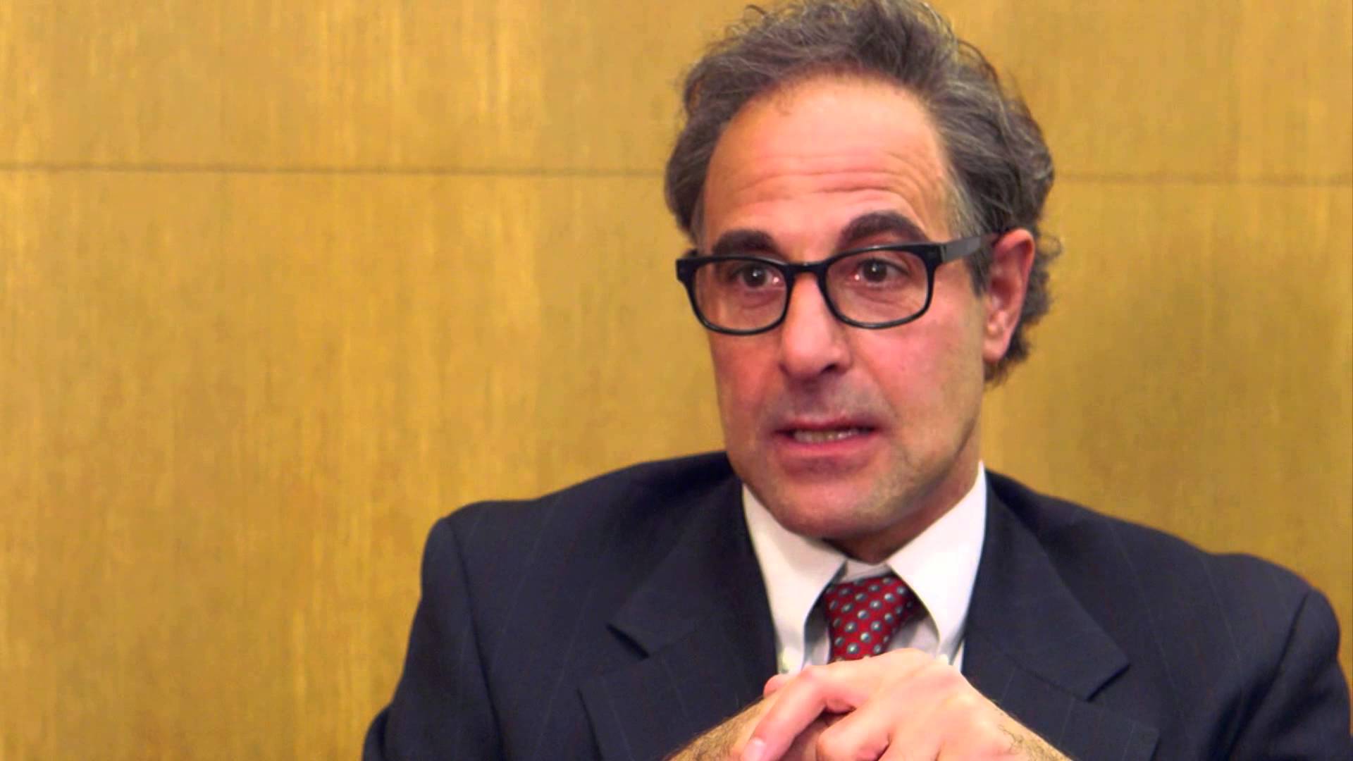 Description: A man in a suit and tie sitting down with his hands folded out in front of him.
