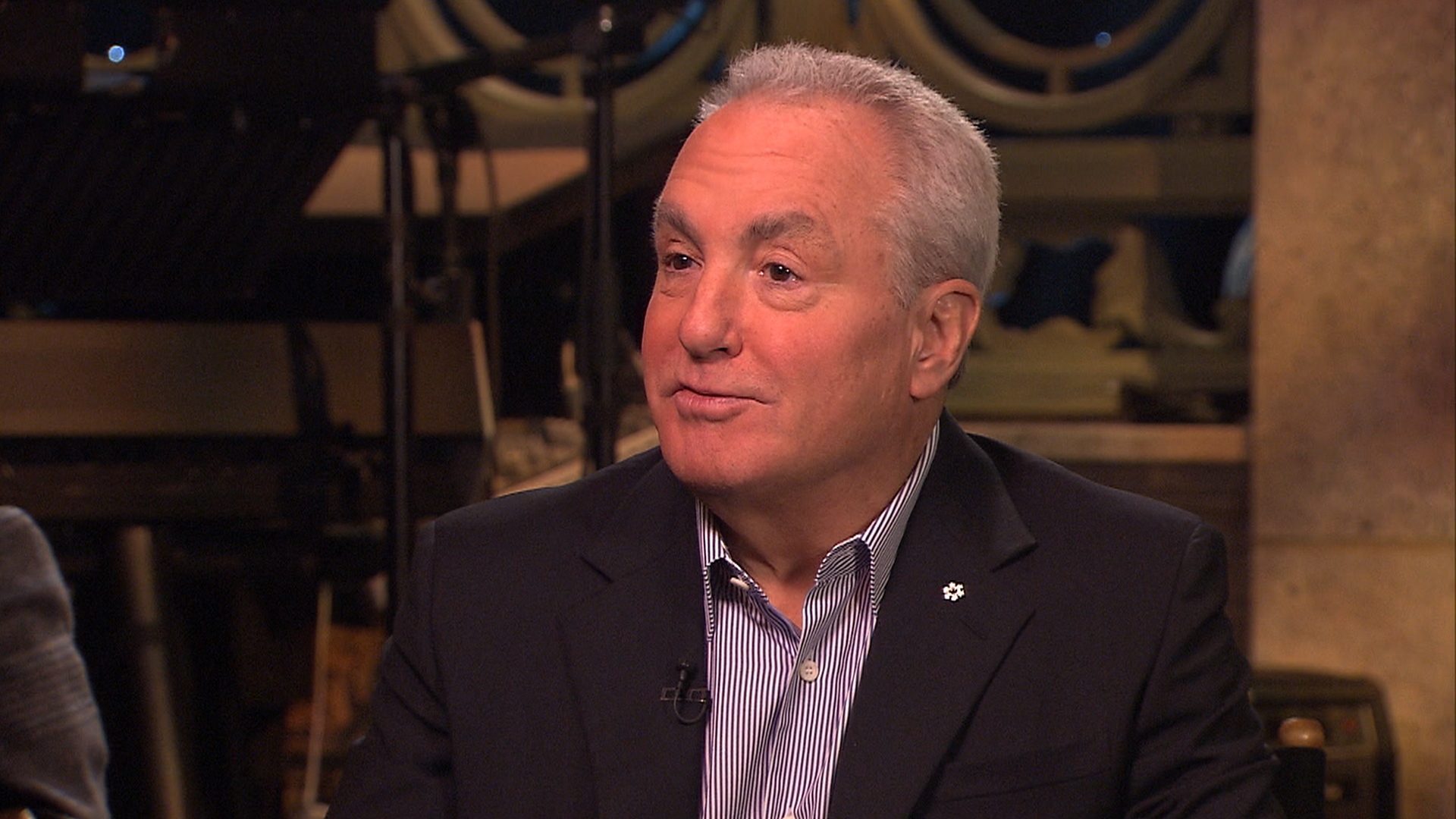 Description: A man in a suit and tie sitting down in a room with a microphone in the background and a microphone in the foreground.