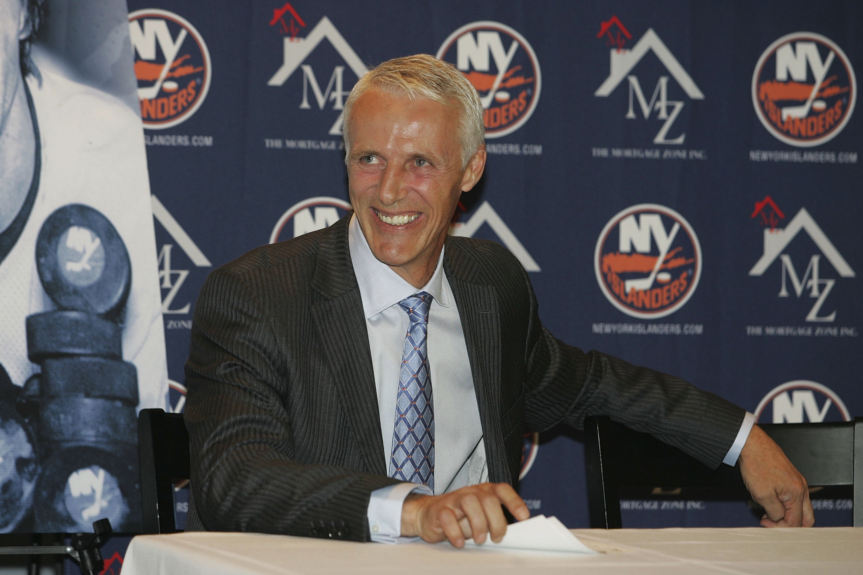 Description: A man in a suit and tie sitting at a table with a microphone in front of him and a poster behind him.