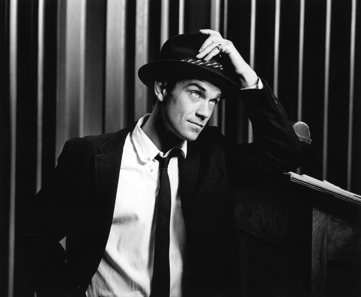Description: A man in a suit and tie leaning against a wall with his hand on his hat and looking at the camera.