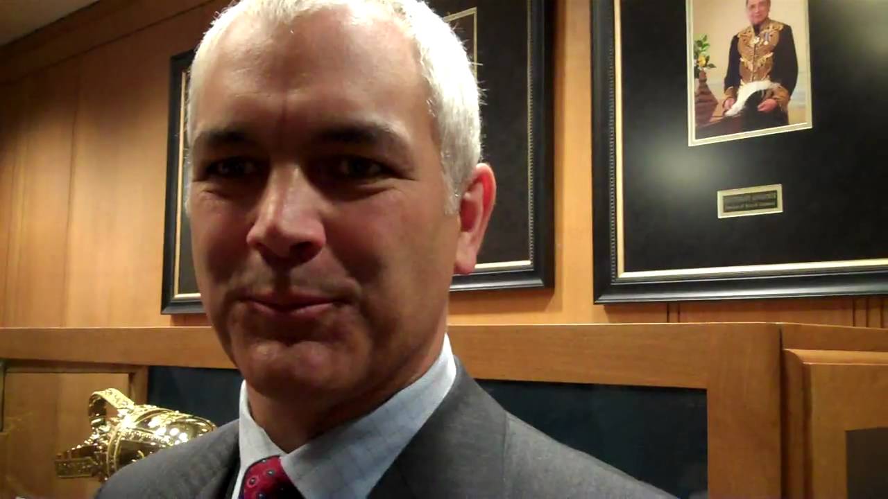 Description: A man in a suit and tie standing in front of a wall with pictures on it and a gold statue.