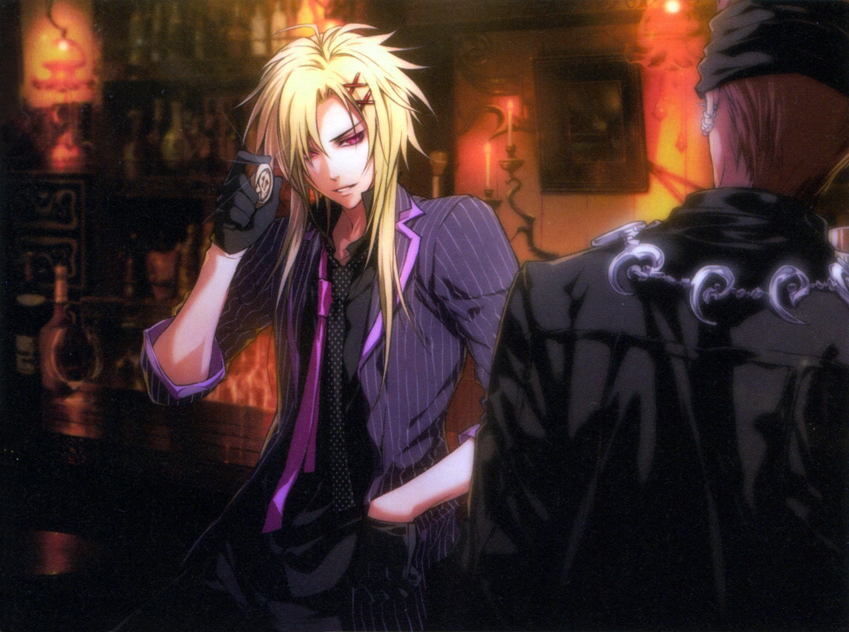 Description: A man in a suit and tie standing next to a woman in a bar with a gun in her hand.